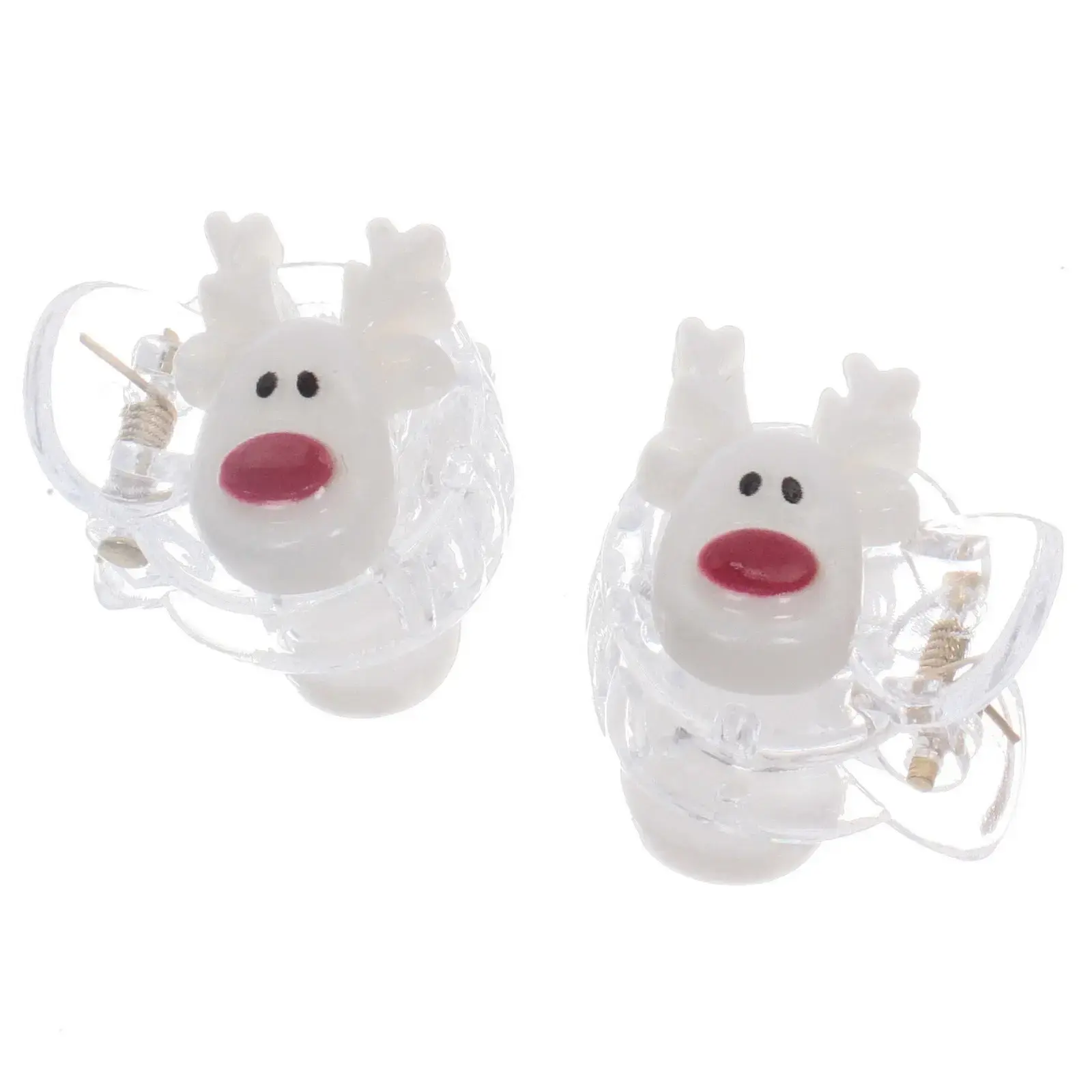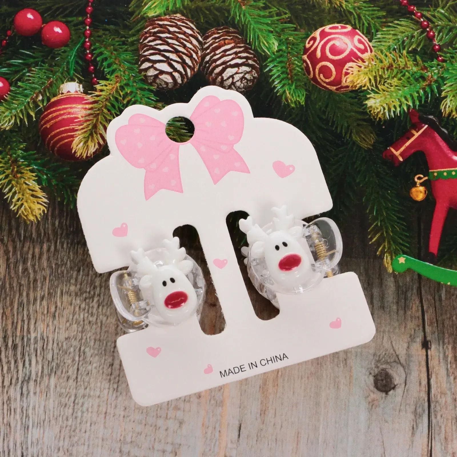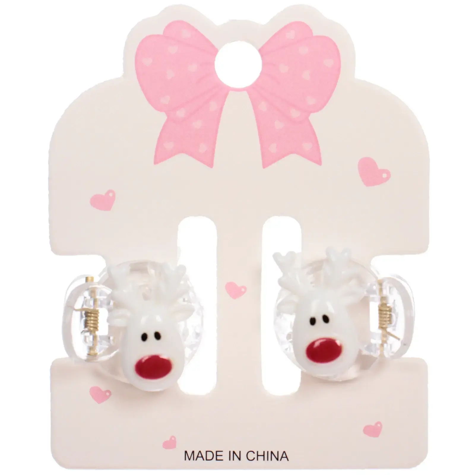 Эти заколки выделяются своим уникальным дизайном в виде головы оленя с рогами, что делает их идеальным аксессуаром для зимних праздников. Белый цвет с красным носом и черными глазами придает им игривый вид, а компактный размер (2 см) делает их удобными для ношения. Заколки упакованы на блистере с розовым бантом, что делает их отличным подарком для детей.