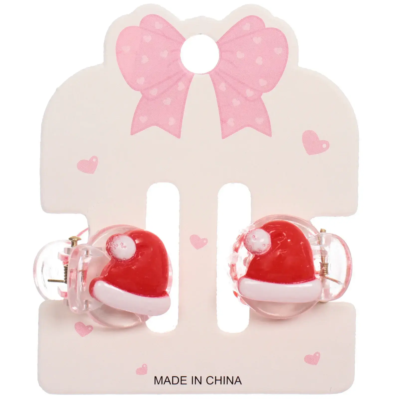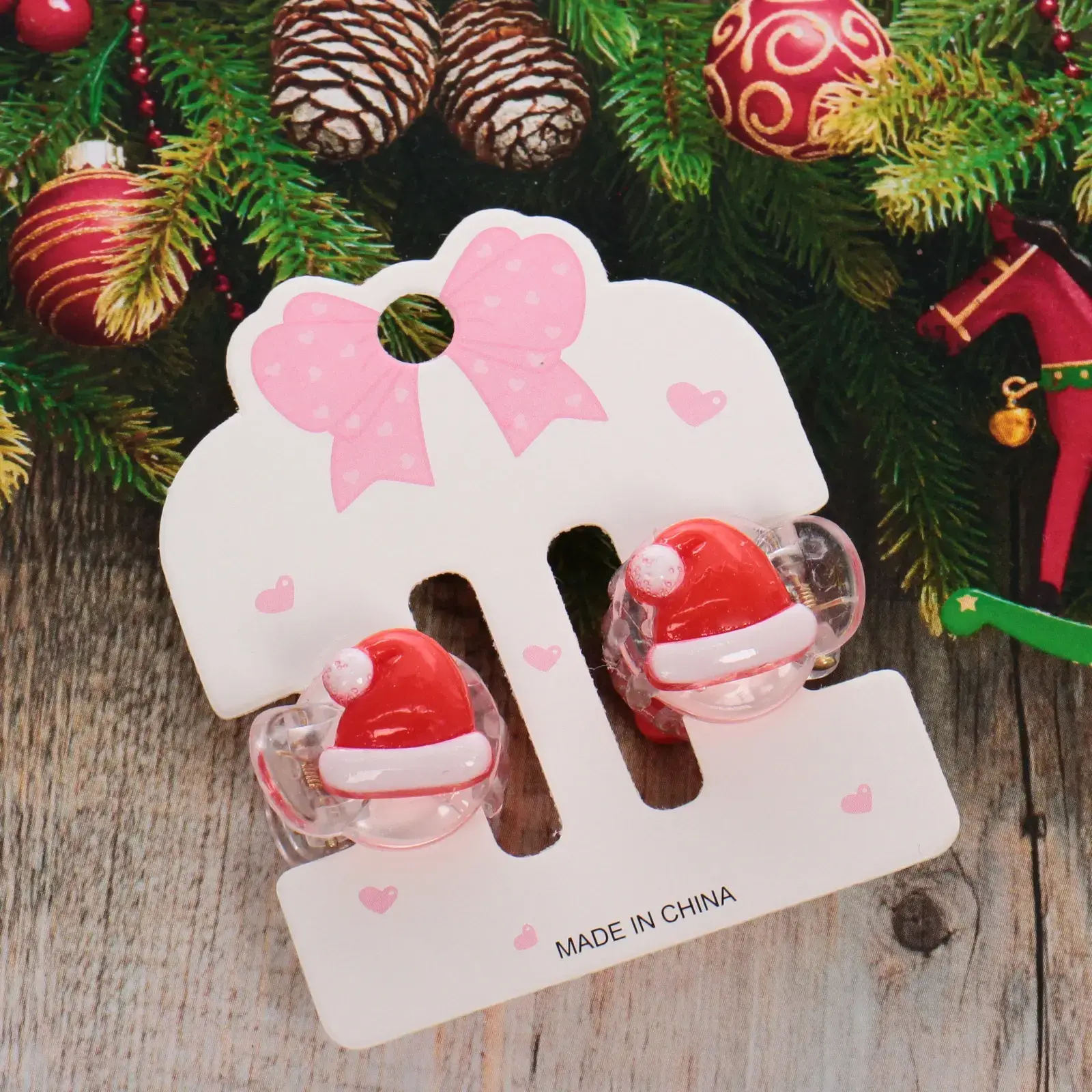 Размер каждой заколки составляет 2 см, что делает их компактными и удобными для хранения. Упаковка с подвесом позволяет легко демонстрировать товар и удобно хранить его. Заколки имеют красный и белый цвет, оформлены в виде новогодних шапочек с помпоном, что делает их идеальными для новогоднего декора.