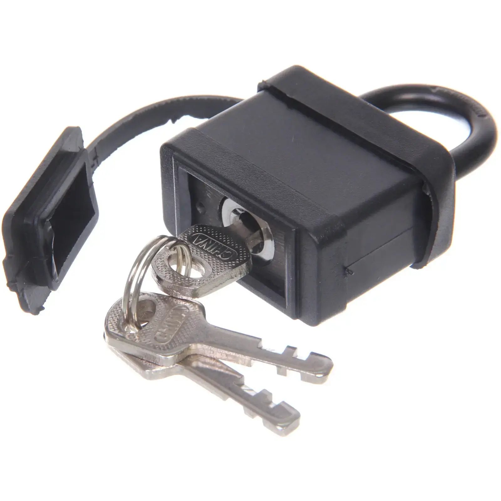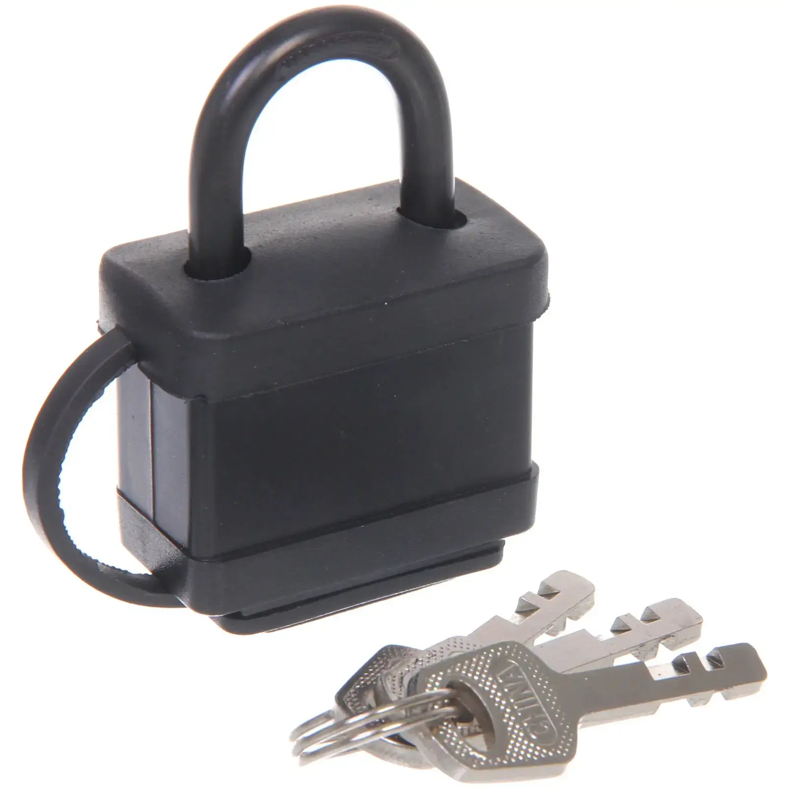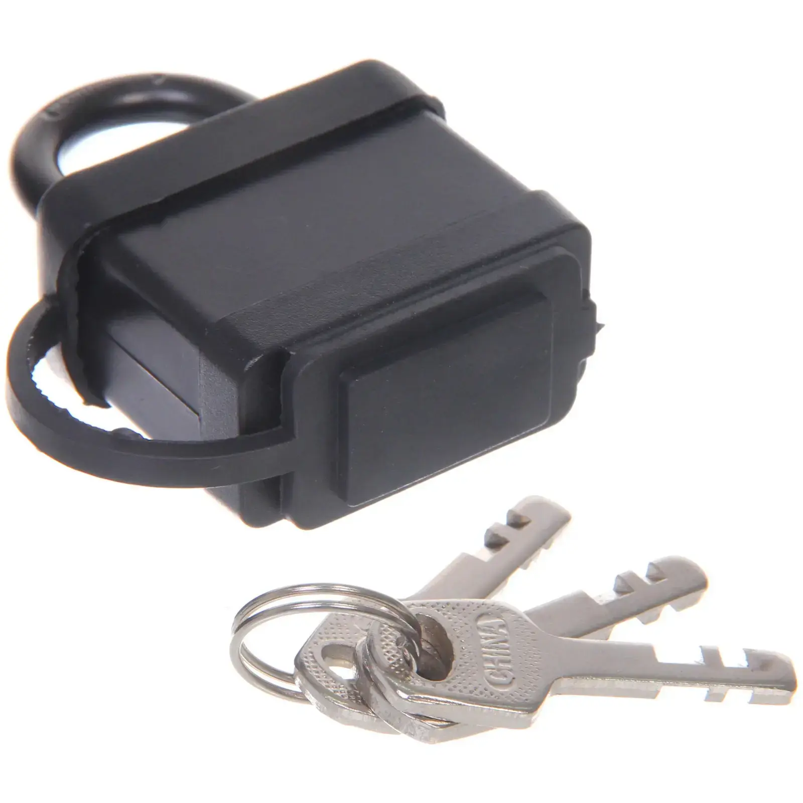 Замок имеет классический черный цвет и прямоугольную форму. Металлическая конструкция гарантирует долговечность использования. В комплект входят 3 металлических ключа стандартной формы с зубчатыми бороздками для надежного запирания.