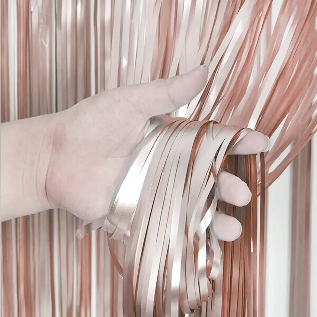 Фольгированный занавес 'Дождь' станет вашим секретным оружием для создания незабываемой атмосферы. Его переливающиеся полосы розового золота притягивают взгляды и дарят ощущение праздника.