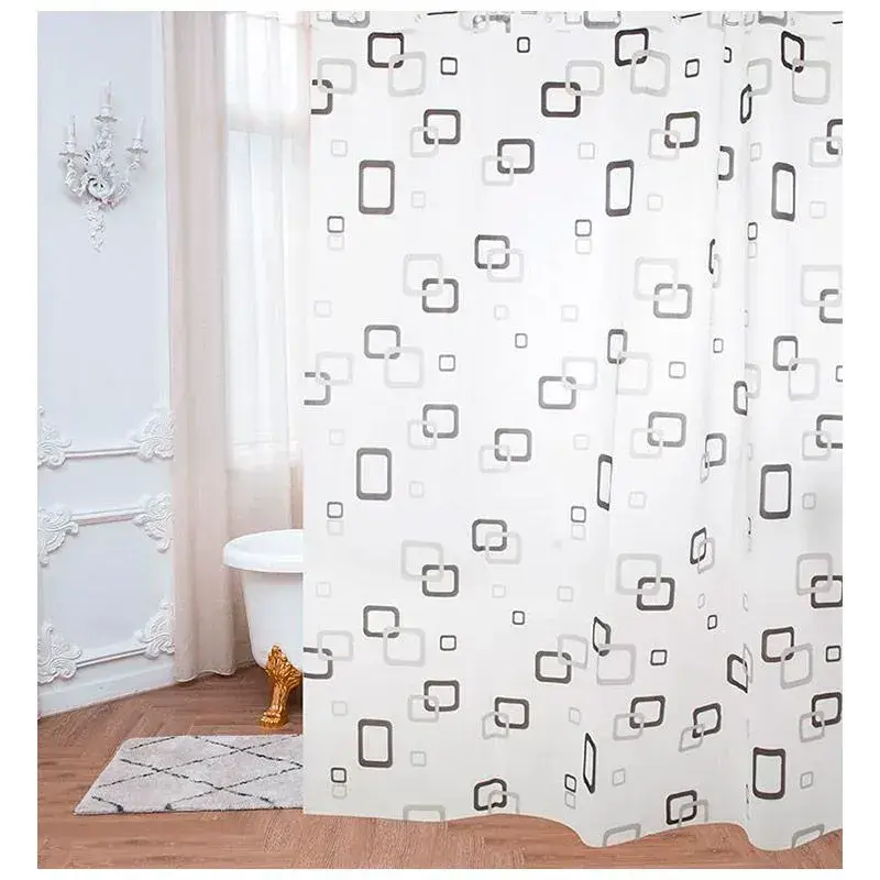 Детали: белый цвет с эффектом полупрозрачности, рисунок — квадраты и прямоугольники в чёрно-серой гамме, размер — 180х180 см. Выбирая эту занавеску, вы получаете практичность, долговечность и свежий вид ванной комнаты каждый день.
