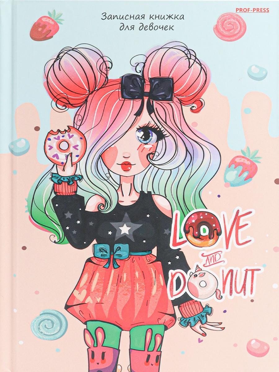 Обложка записной книжки оформлена в нежных пастельных тонах, в основном голубом, розовом и зеленом цветах. На ней изображён мультяшный персонаж с длинными волосами, окрашенными в розовые и зеленые оттенки, который держит пончик. Внизу обложки расположены надписи "LOVE" и "DONUT", выполненные в ярком шрифте. Эта записная книжка станет не только полезным аксессуаром, но и стильным элементом, который подчеркнёт индивидуальность её обладательницы.