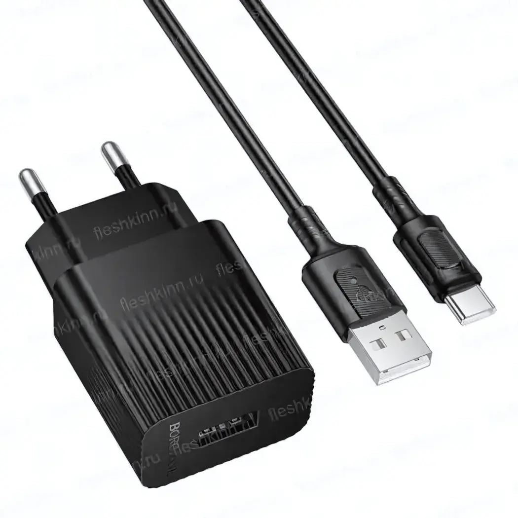 Адаптер оснащен двухконтактной вилкой европейского формата (Europlug), которая легко подходит к большинству розеток. Материал корпуса и разъемов — прочный пластик, обеспечивающий долговечность использования. Комплект включает один адаптер и один кабель черного цвета длиной 1 м с разъемами USB-A и USB-C.