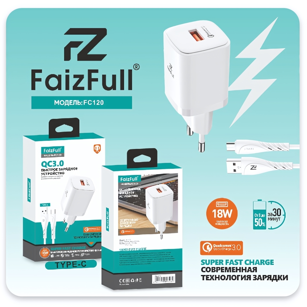 Зарядное устройство FaizFull FC120 с кабелем Type-C — ваш надежный помощник в мире цифровых технологий. Компактный блок питания с поддержкой Quick Charge 3.0 заряжает устройства на 80% всего за 30 минут, экономя ваше время для важных дел.