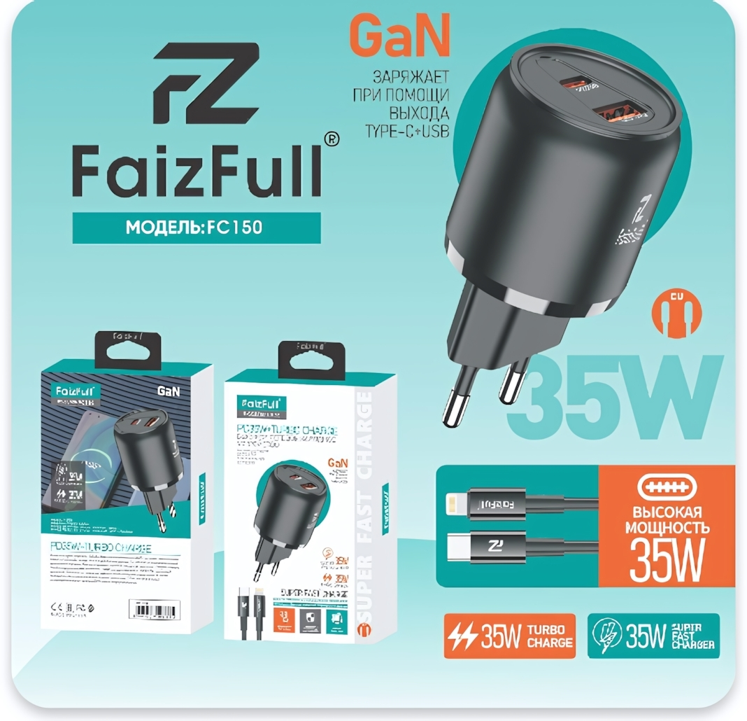 Зарядное устройство FaizFull FC150 — это идеальный выбор для тех, кто ценит скорость и надежность. С мощностью 35W и технологией GaN, это устройство обеспечивает быструю зарядку ваших гаджетов, позволяя вам экономить время и быть всегда на связи.