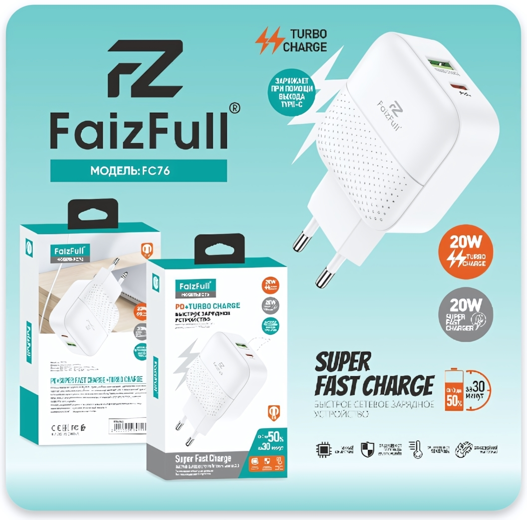 Зарядное устройство FaizFull FC76 с технологиями Power Delivery 20W и Quick Charge 3.0 обеспечивает быструю зарядку смартфонов, планшетов и других гаджетов. Заряжайте устройства до 50% всего за 30 минут – идеально для активного образа жизни, когда каждая минута на счету.