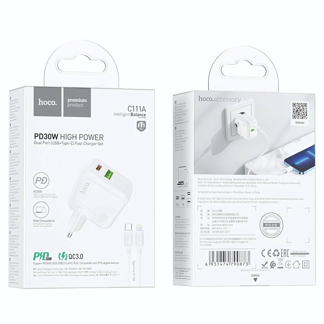 Зарядное устройство HOCO C111A с быстрой зарядкой 30W, 2 порта (Type-C/USB), белое