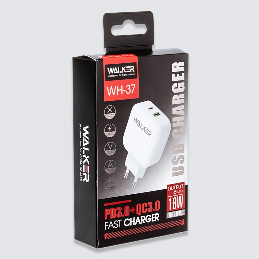 Зарядное устройство WALKER «WH-37», 18Вт, QC 3.0+PD, 2 порта USB/Type-C, черный