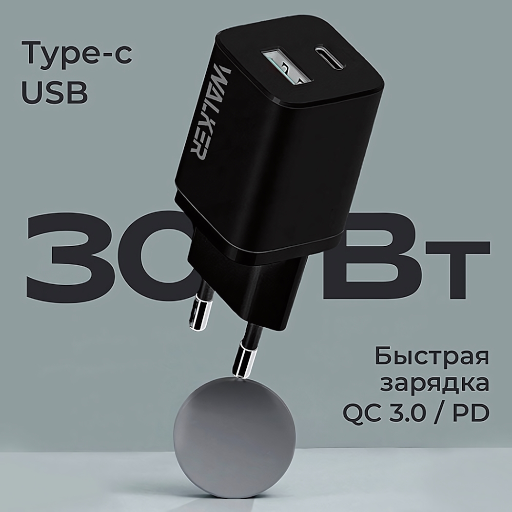 Зарядное устройство WALKER «WH-60», 30Вт, USB+Type-C, быстрая зарядка QC 3.0/PD, черный