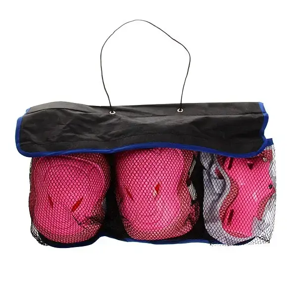 Комплект включает в себя две пары налокотников и наколенников, а также защитные накладки для кистей. Все элементы удобно хранятся в специальной сумке, выполненной из сетчатого материала, что позволяет видеть содержимое и обеспечивает дополнительную вентиляцию. Сумка имеет ручку для удобной переноски, что делает комплект идеальным для поездок на природу или в спортзал.