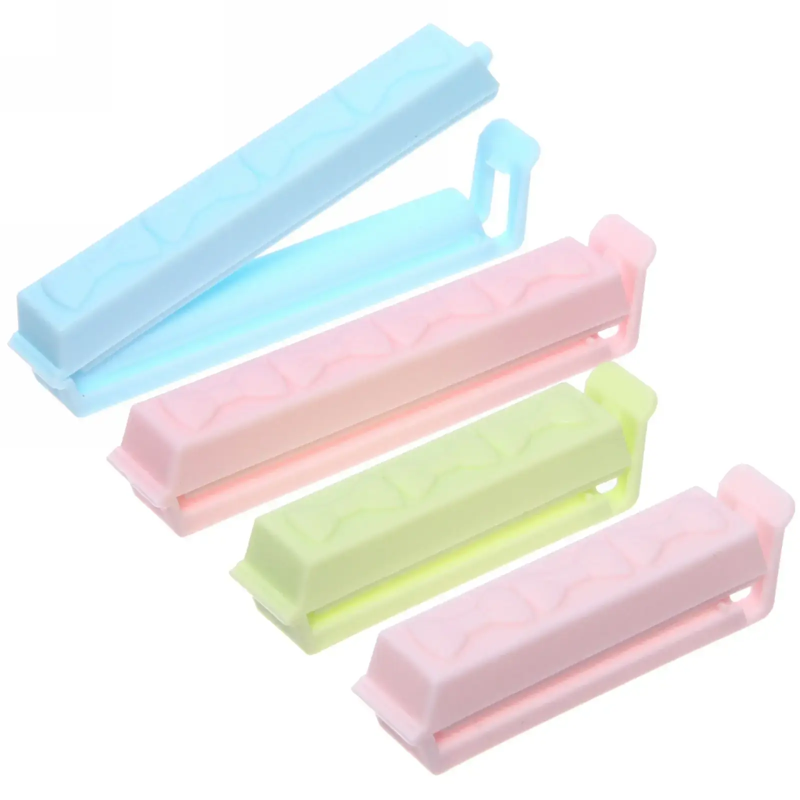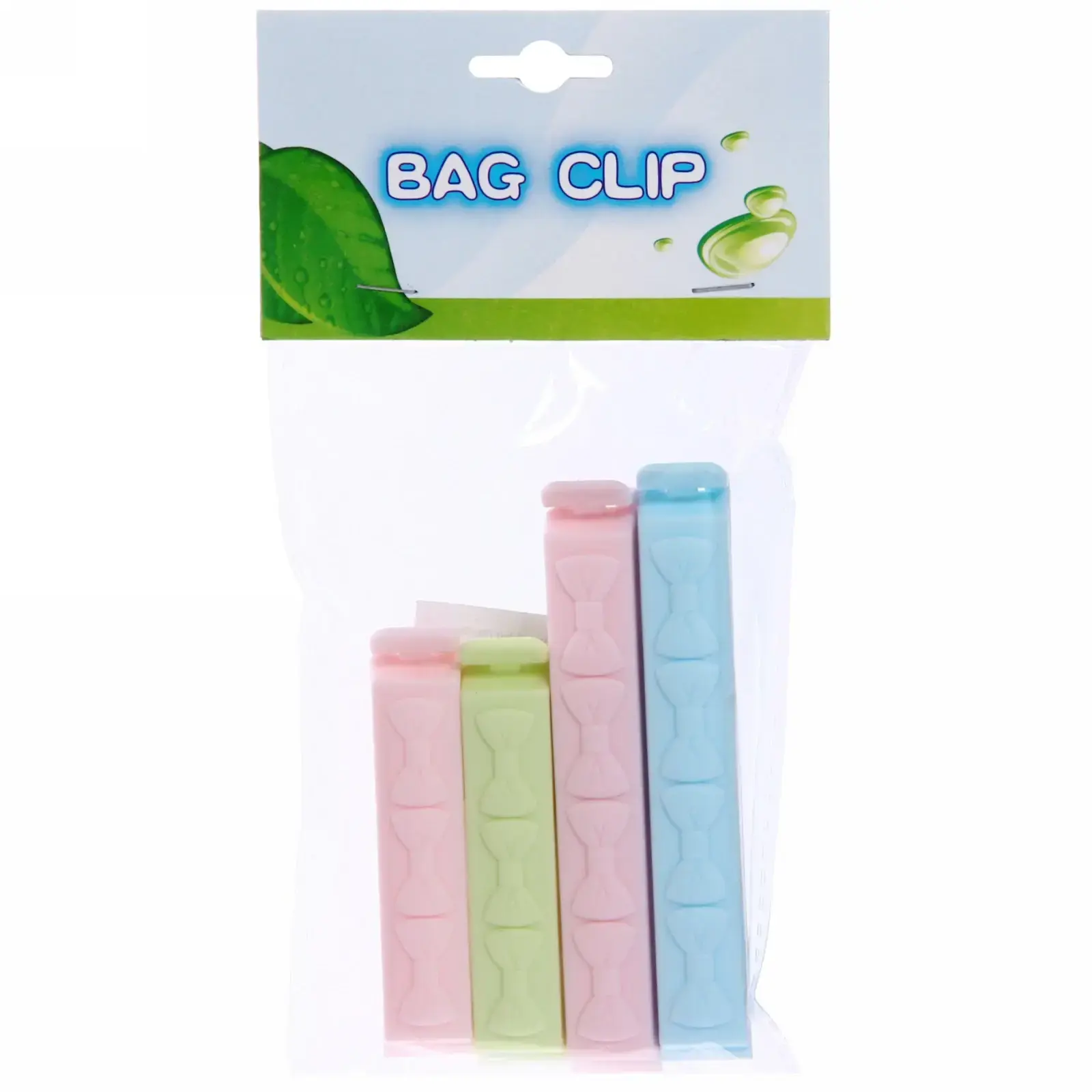 Зажимы идеально подходят для использования с бумажными и полиэтиленовыми пакетами. Они легко захватываются и обеспечивают надежное закрытие, что позволяет избежать потери свежести продуктов. Каждый зажим имеет рельефный узор в виде бантиков, что делает их не только функциональными, но и стильными. В комплект входят четыре зажима разных цветов: голубой, розовый, зеленый и светло-розовый, что добавляет яркости в вашу кухню.