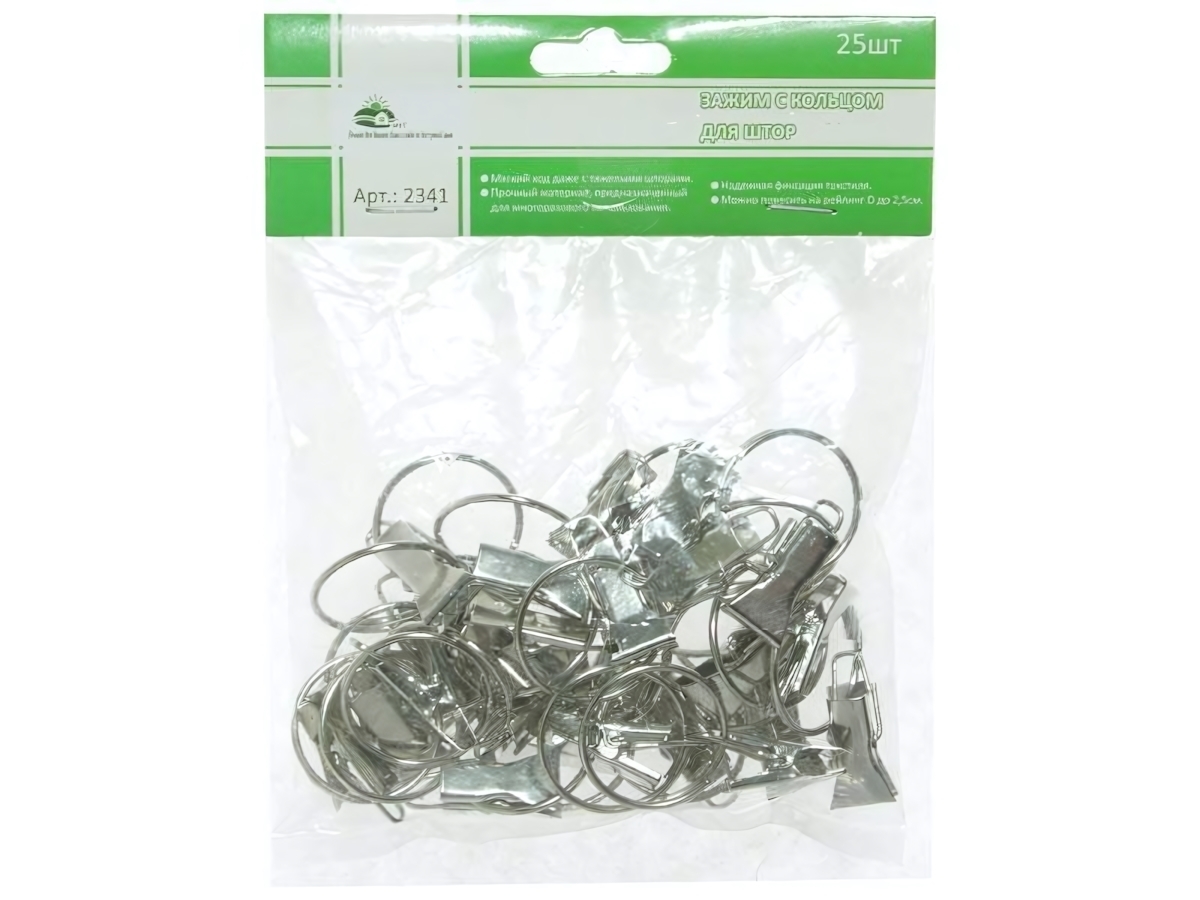 Каждый зажим имеет кольцо, что облегчает процесс крепления. Упаковка с зеленой и белой маркировкой не только информативна, но и удобна для хранения. Зажимы легко использовать и они подходят для большинства типов штор. Не упустите возможность сделать ваш дом более уютным и стильным с помощью этих зажимов!