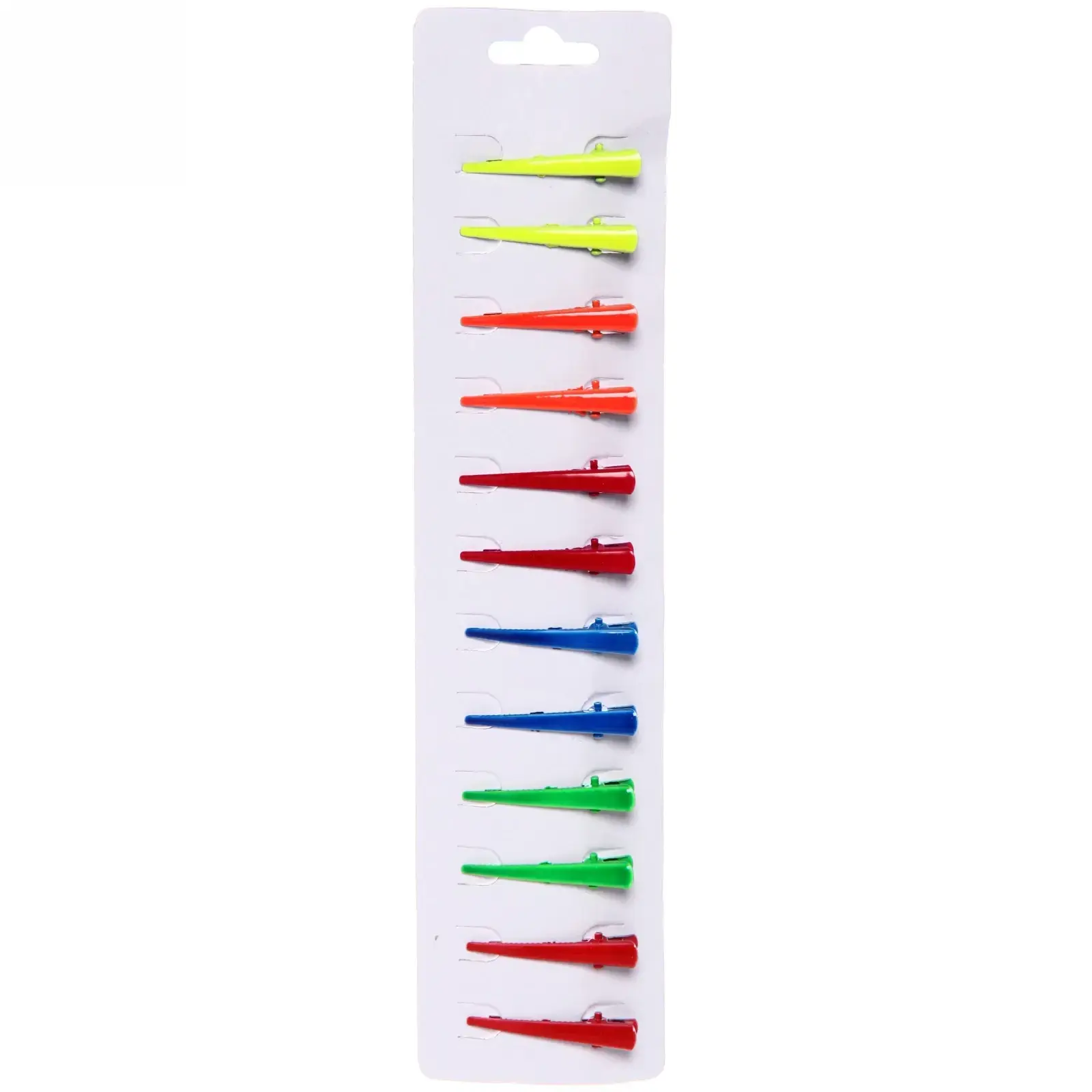 Каждый зажим имеет длину 6 см и выполнен из прочного металла, что гарантирует надежное удержание волос. Набор включает 12 зажимов различных ярких цветов: желтый, оранжевый, красный, синий и зеленый. Упаковка выполнена из пластика и имеет отверстие для подвешивания, что делает хранение удобным и практичным.