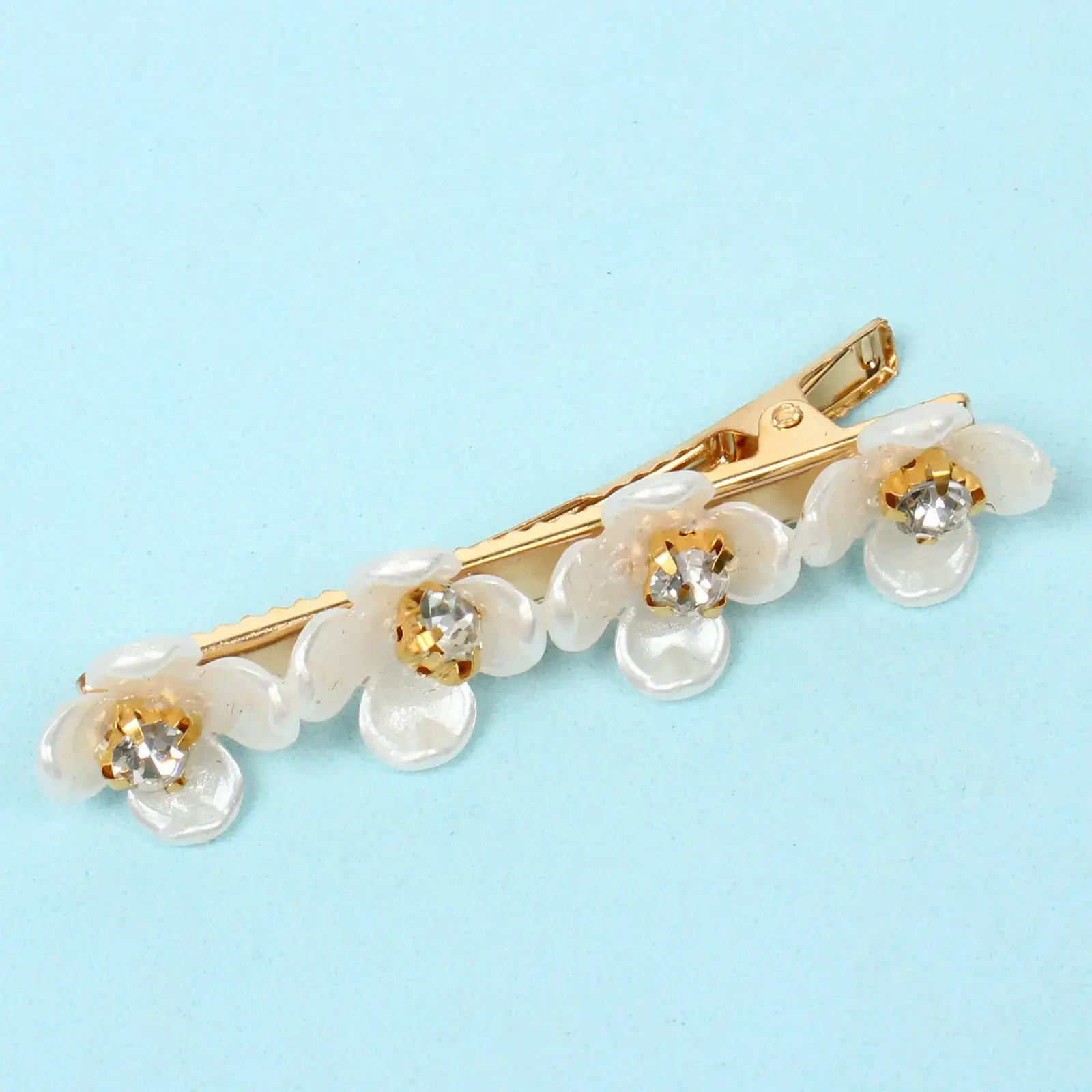Металлическая основа с золотистым покрытием гарантирует долговечность использования. Прозрачные стразы в центре каждого цветка создают эффектный блеск при любом освещении. Компактный размер (6х1.5см) позволяет использовать зажим как для декоративного оформления, так и для функционального закрепления прически.
