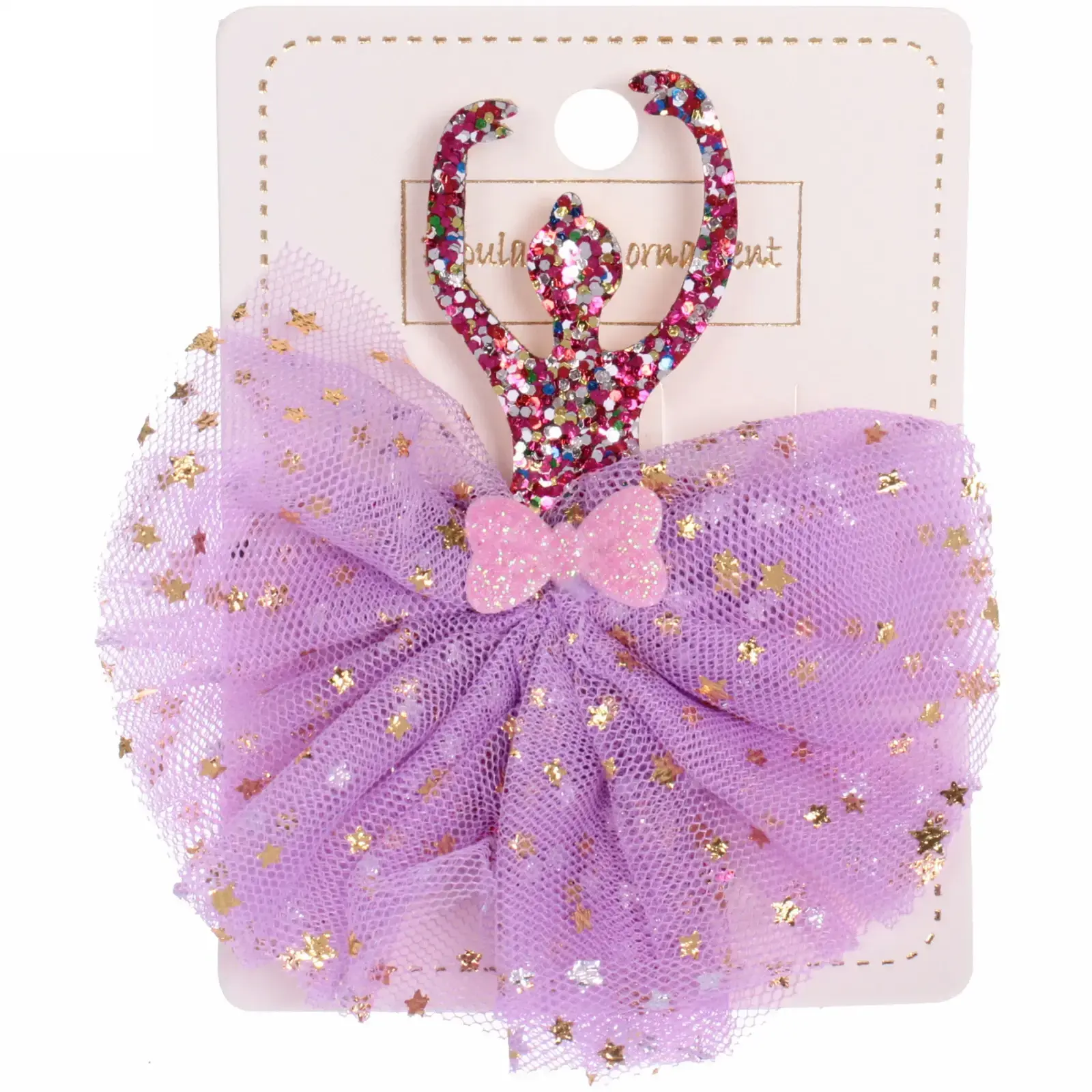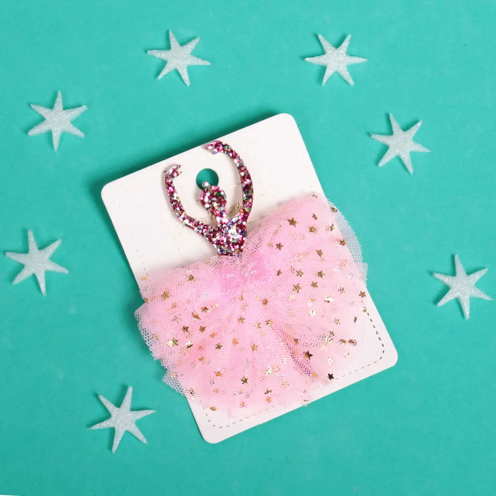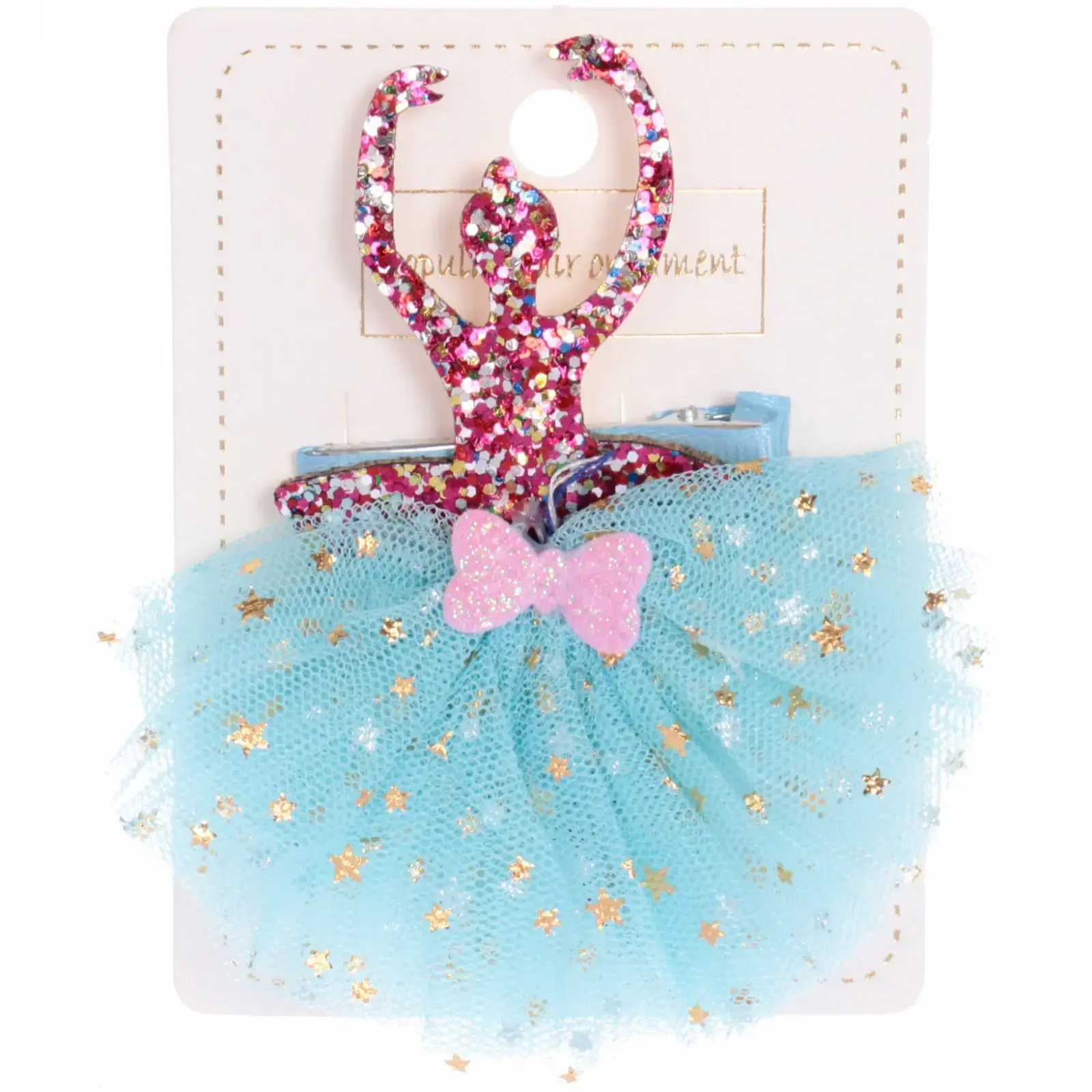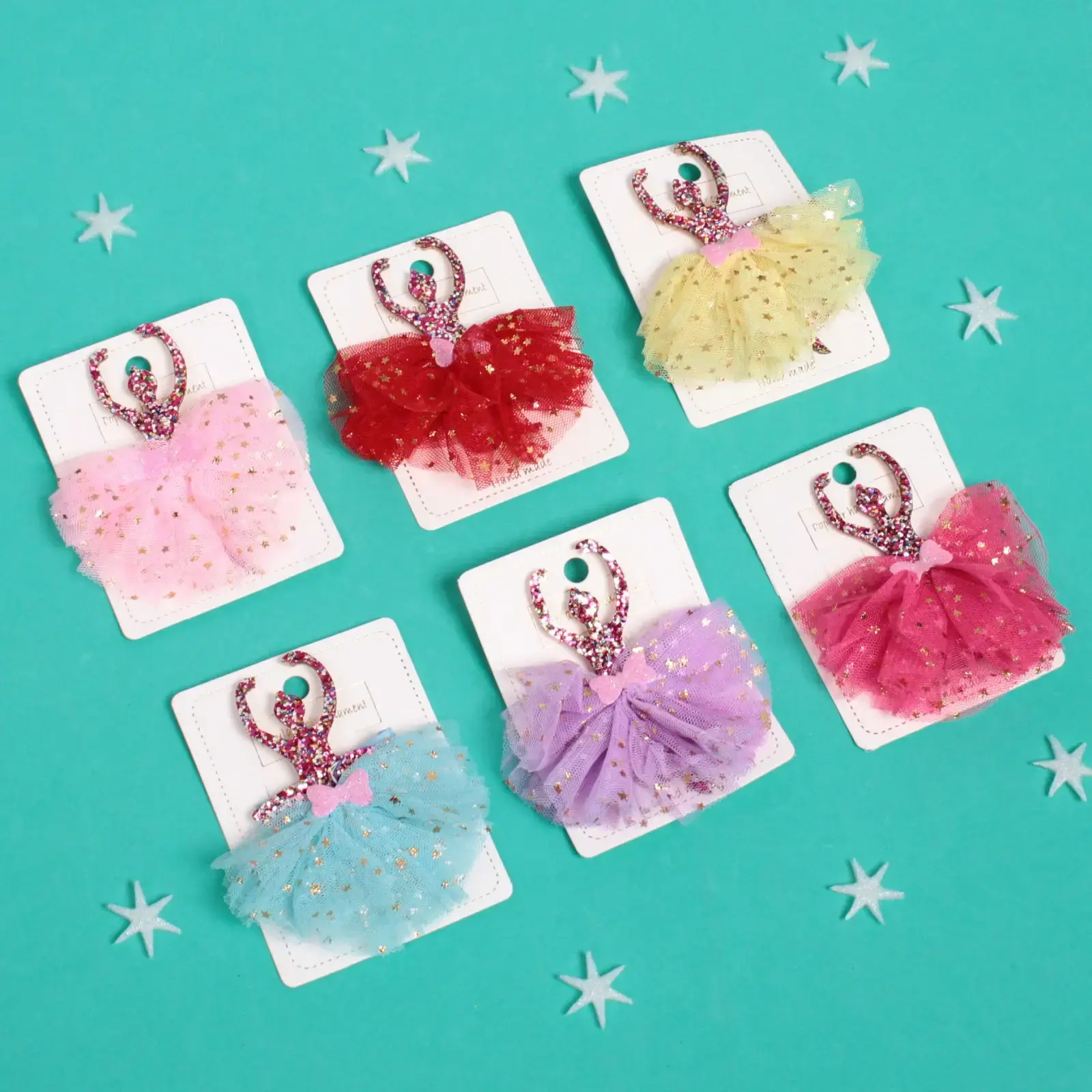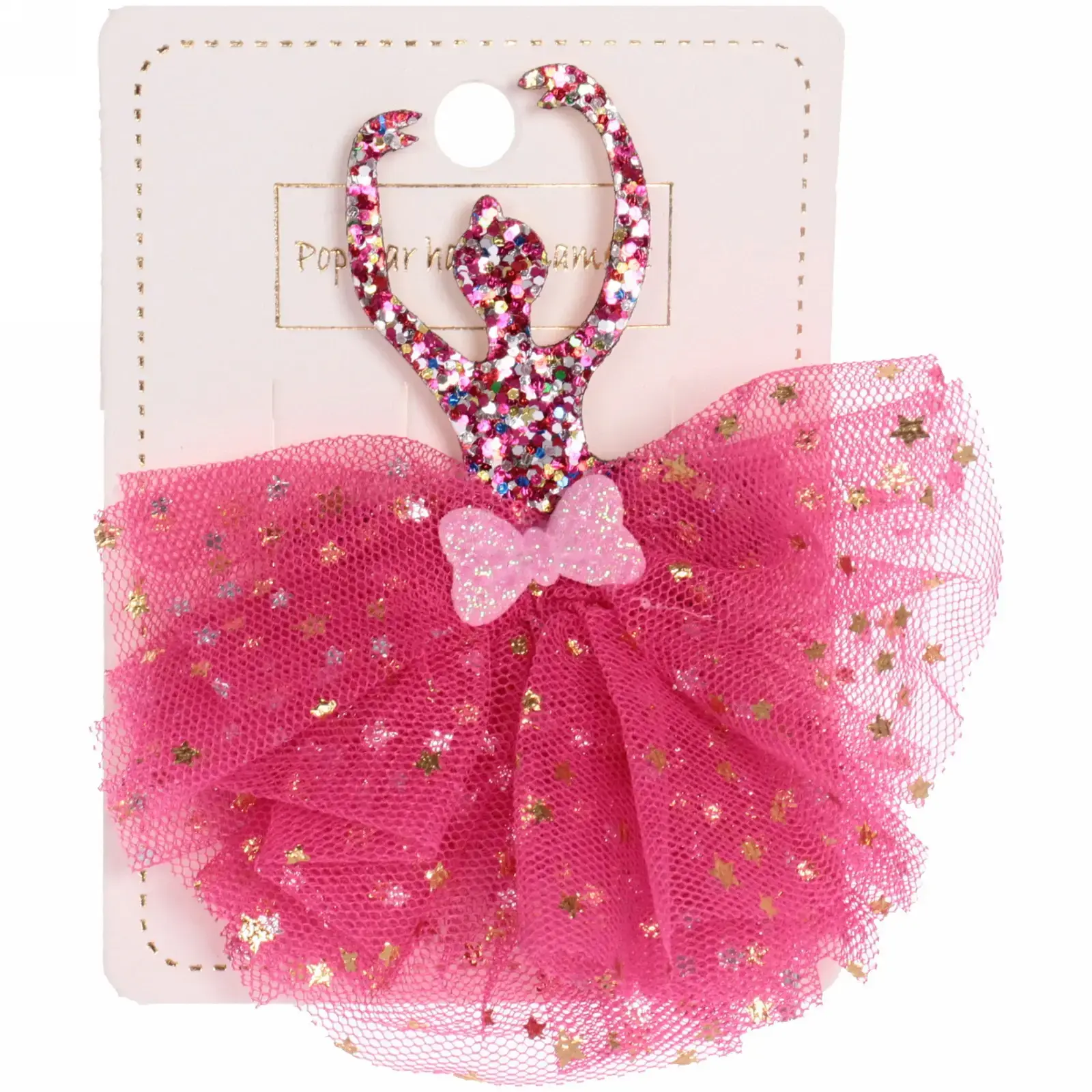Размер зажима составляет 8,5*10 см, что делает его идеальным для детских волос. Каждый зажим украшен фигуркой балерины с юбочкой из тюля и блестящими элементами, что придает ему особый шарм. Упаковка с возможностью подвешивания позволяет удобно демонстрировать товар в магазине.
