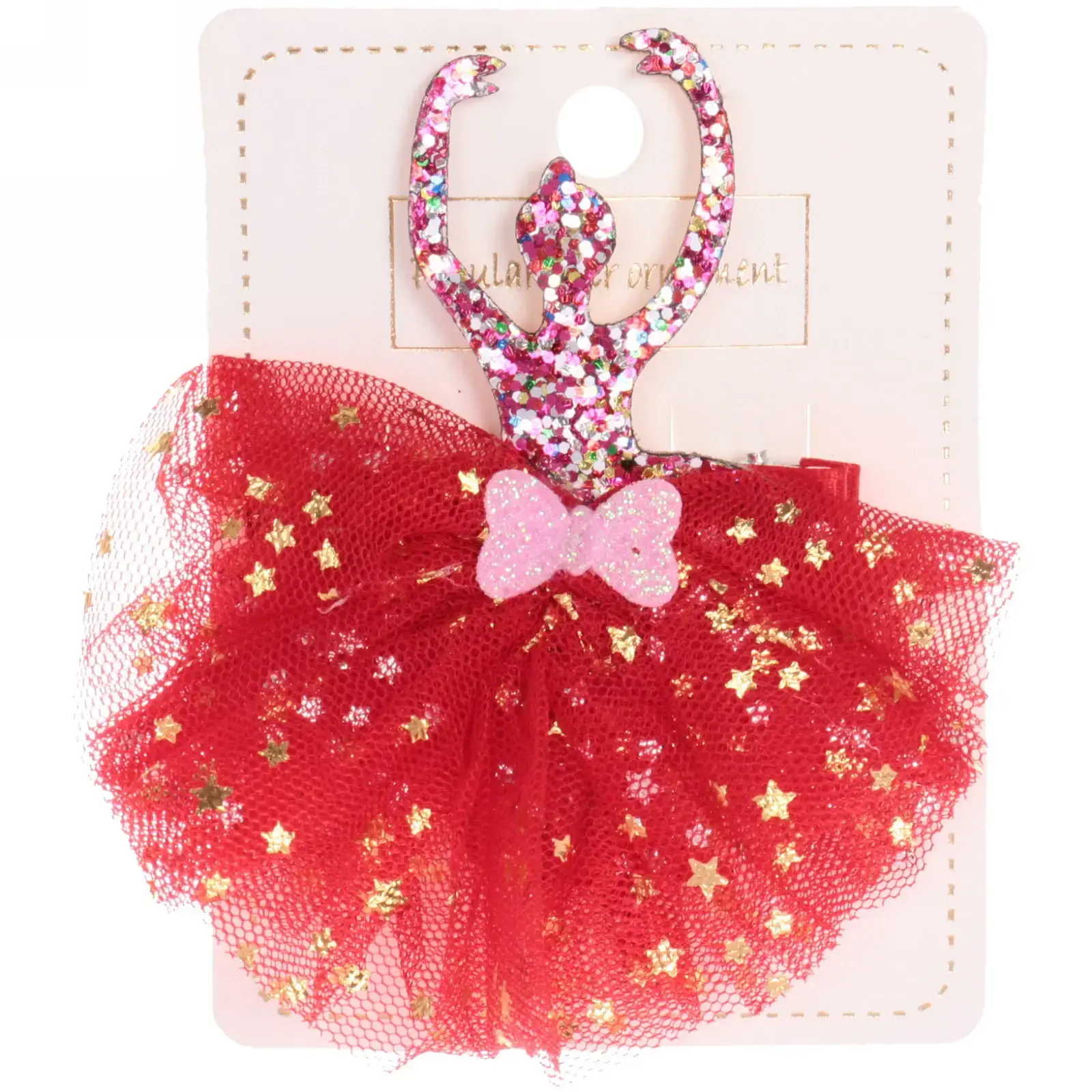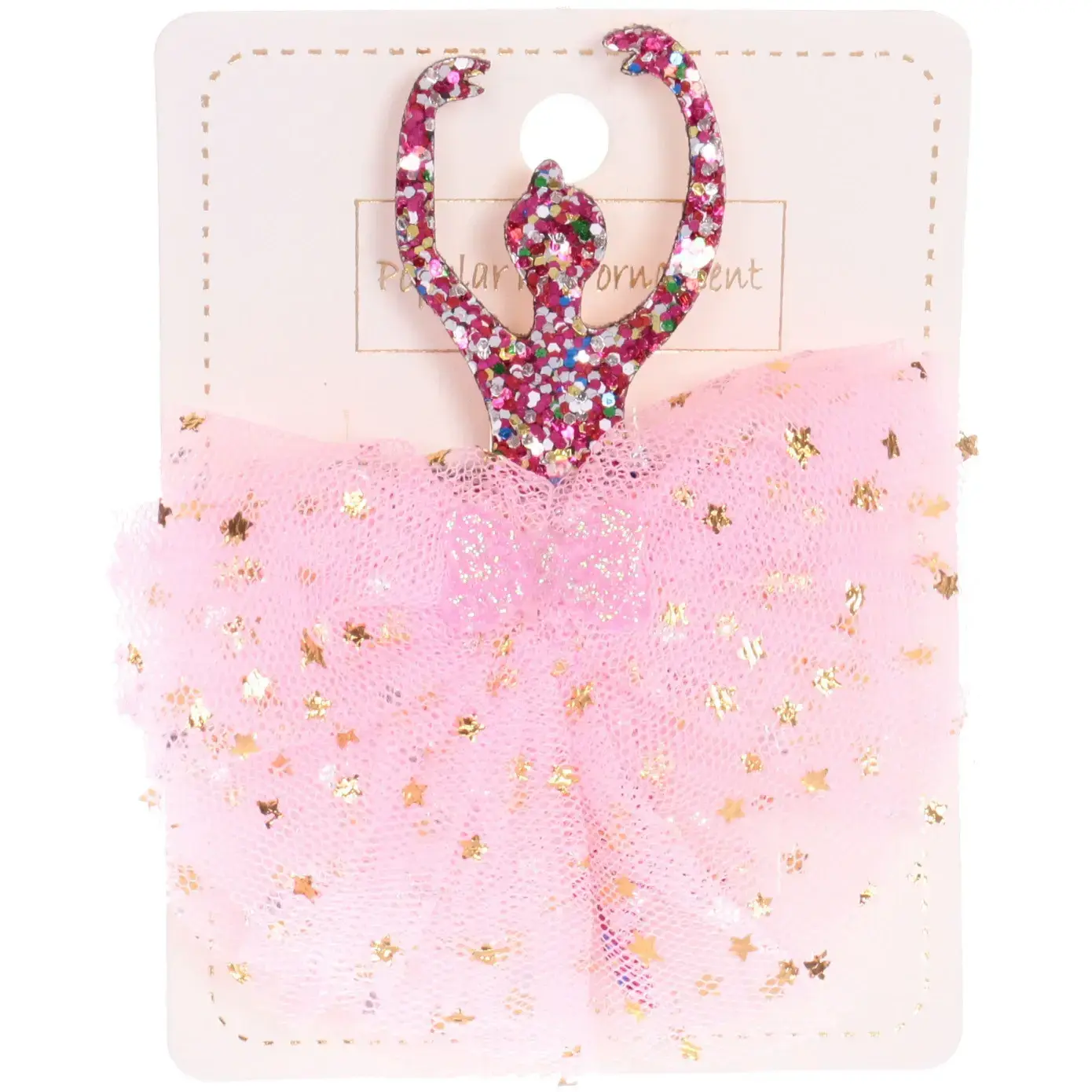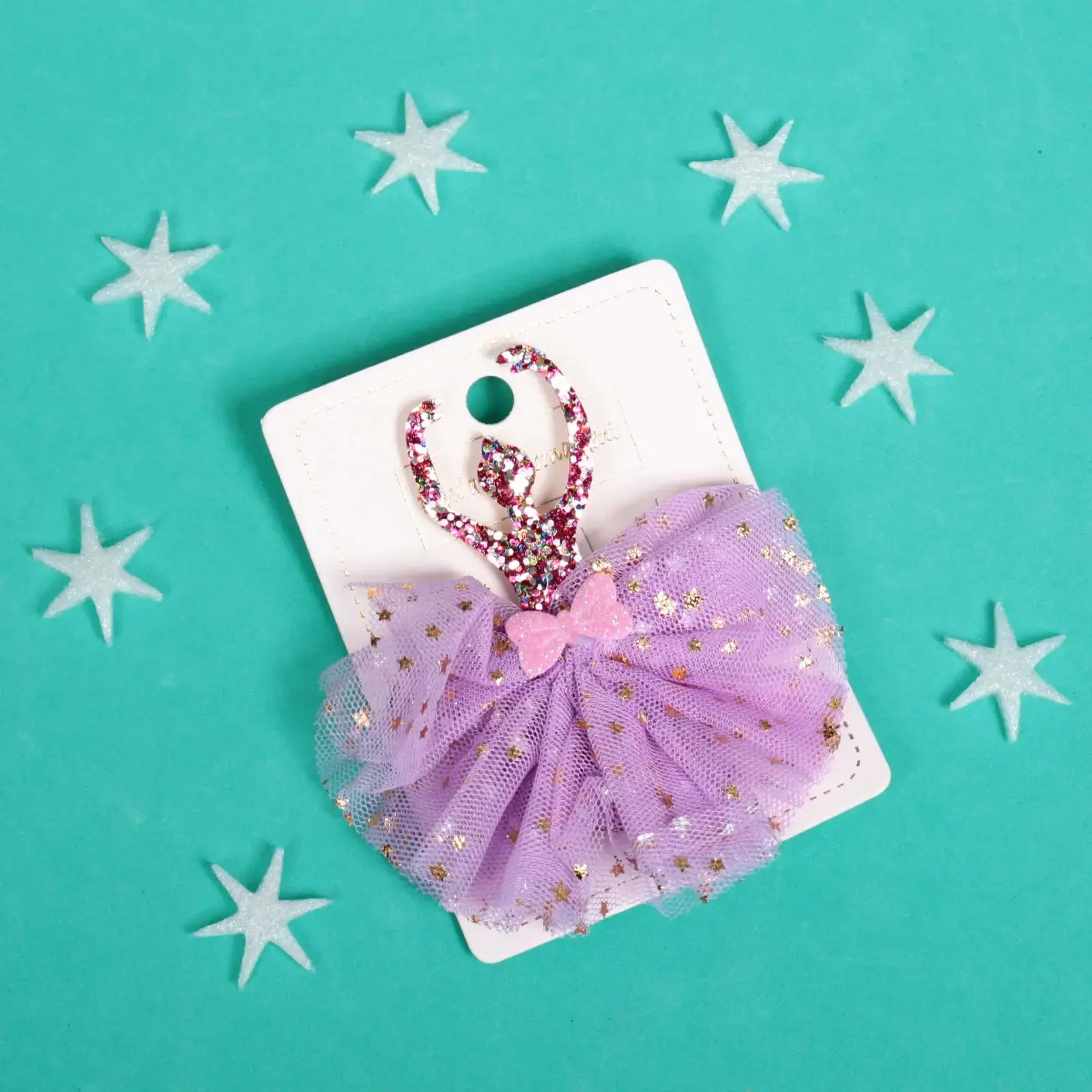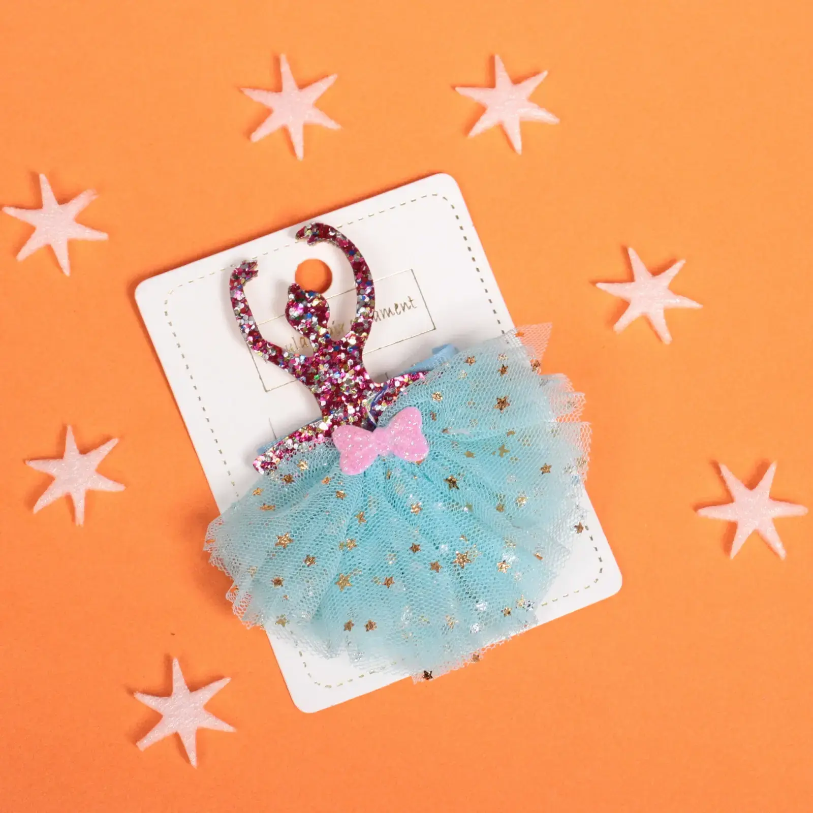 Размер зажима составляет 8,5*10 см, что делает его идеальным для детских волос. Каждый зажим украшен фигуркой балерины с юбочкой из тюля и блестящими элементами, что придает ему особый шарм. Упаковка с возможностью подвешивания позволяет удобно демонстрировать товар в магазине.