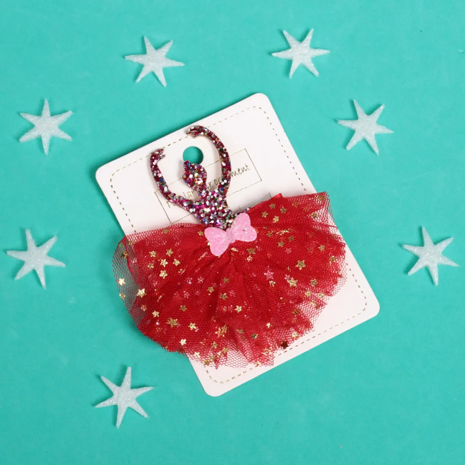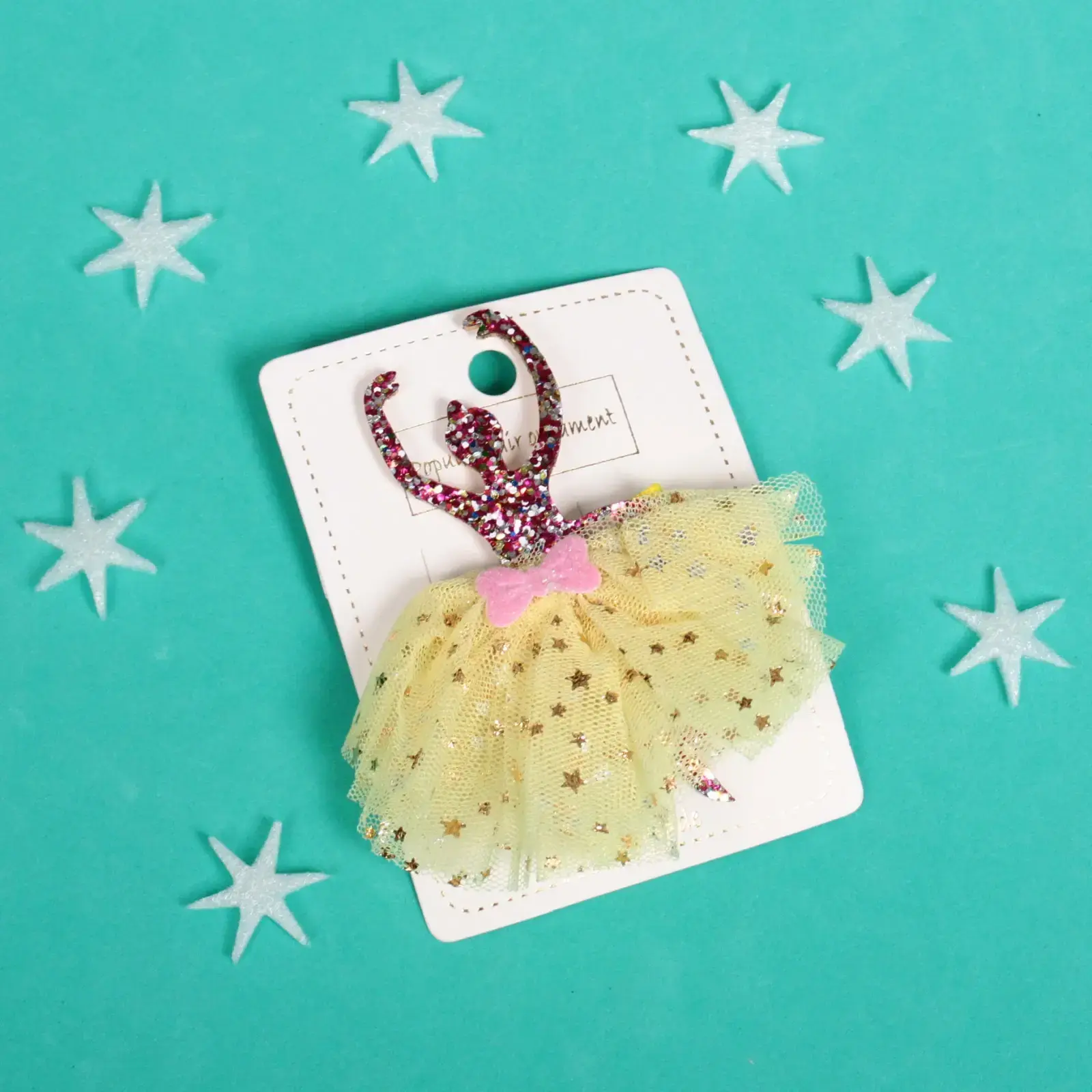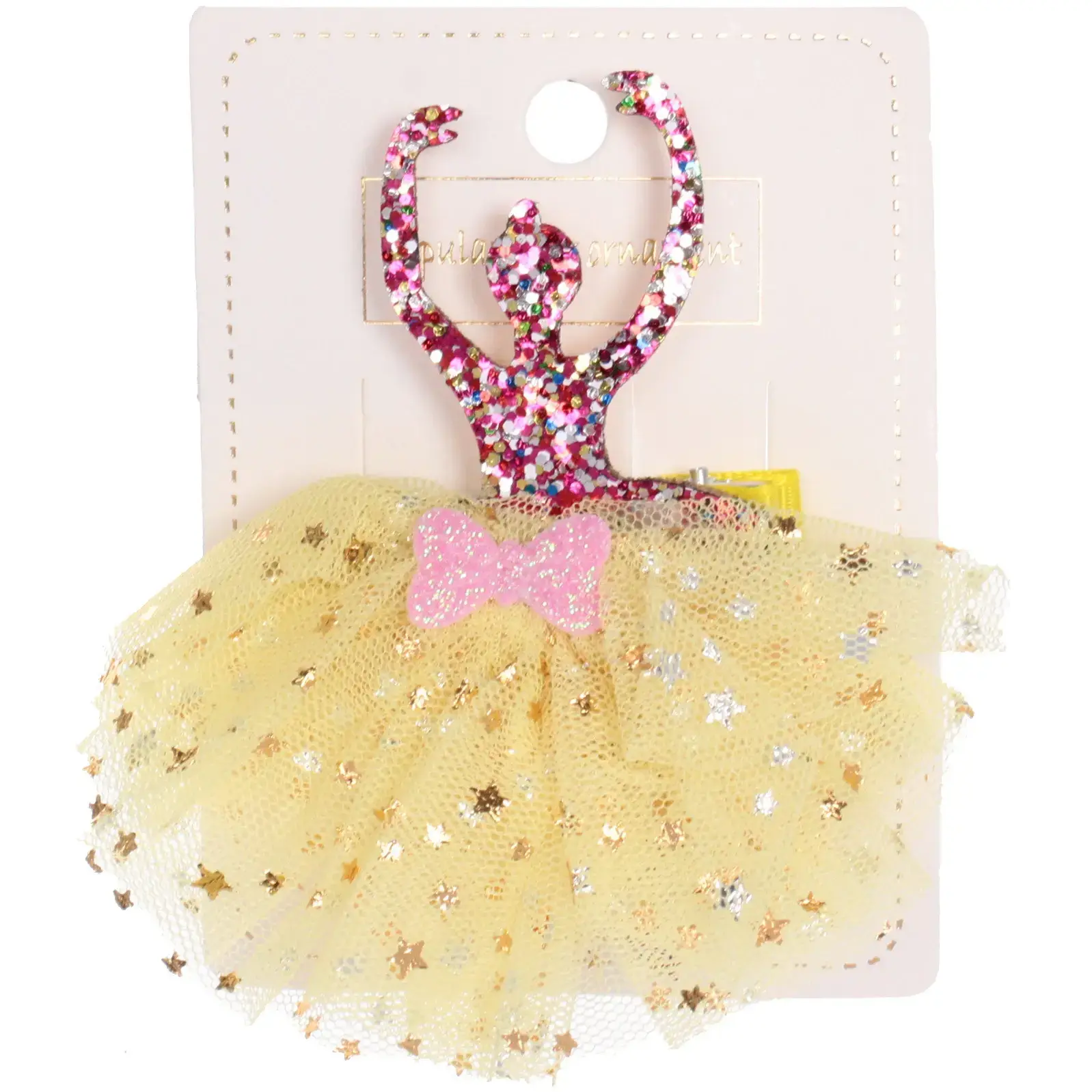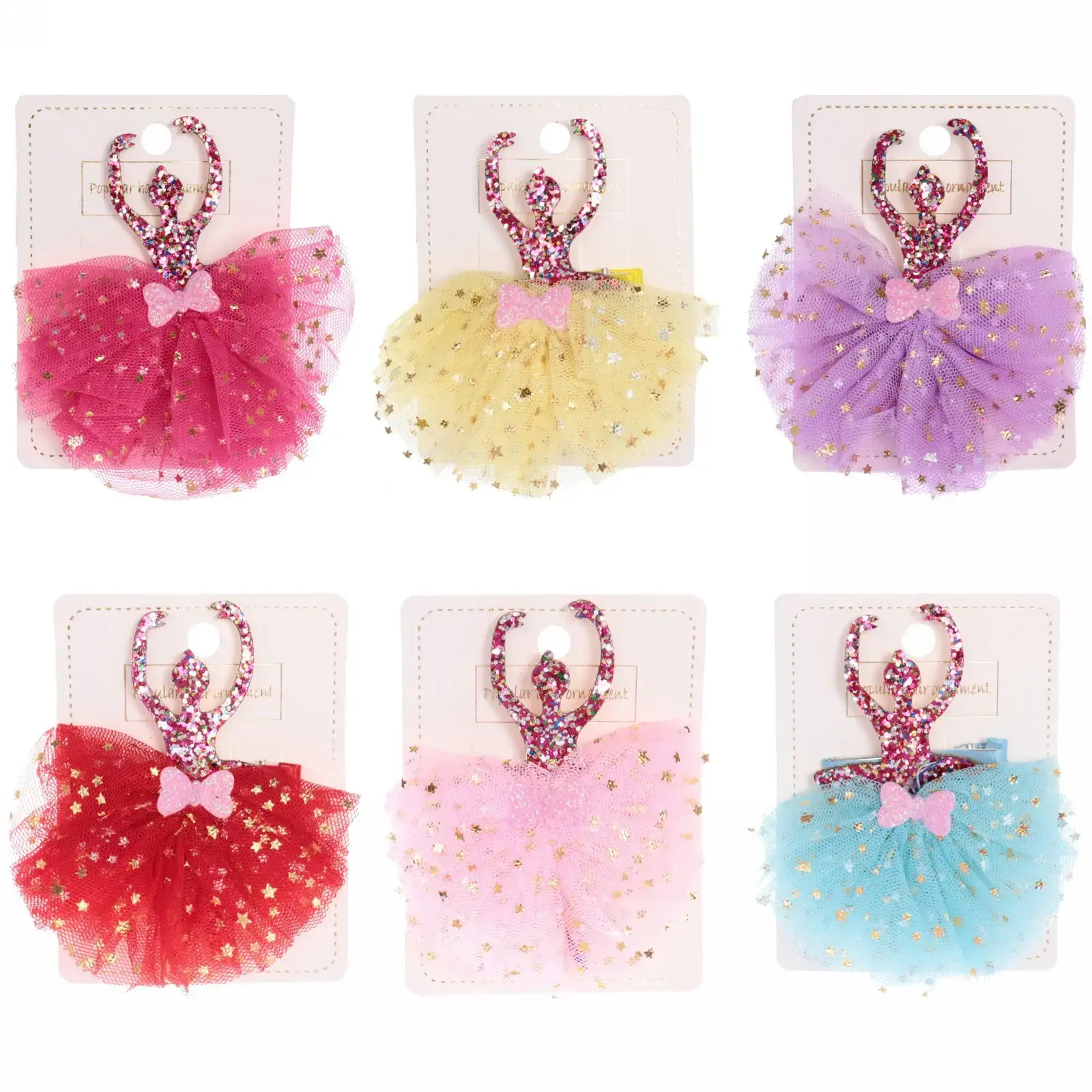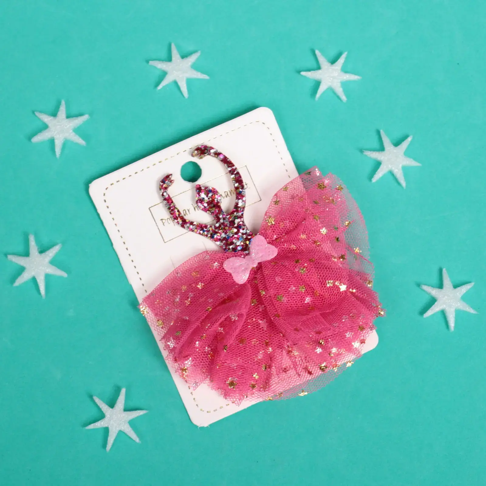 Размер зажима составляет 8,5*10 см, что делает его идеальным для детских волос. Каждый зажим украшен фигуркой балерины с юбочкой из тюля и блестящими элементами, что придает ему особый шарм. Упаковка с возможностью подвешивания позволяет удобно демонстрировать товар в магазине.