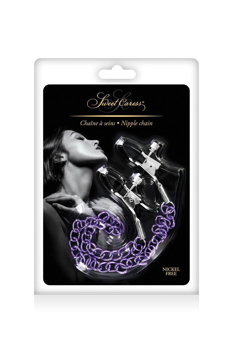 Зажимы для сосков с цепочкой «Sweet Caress Nipple Chain», металл, фиолетовый, защитные колпачки