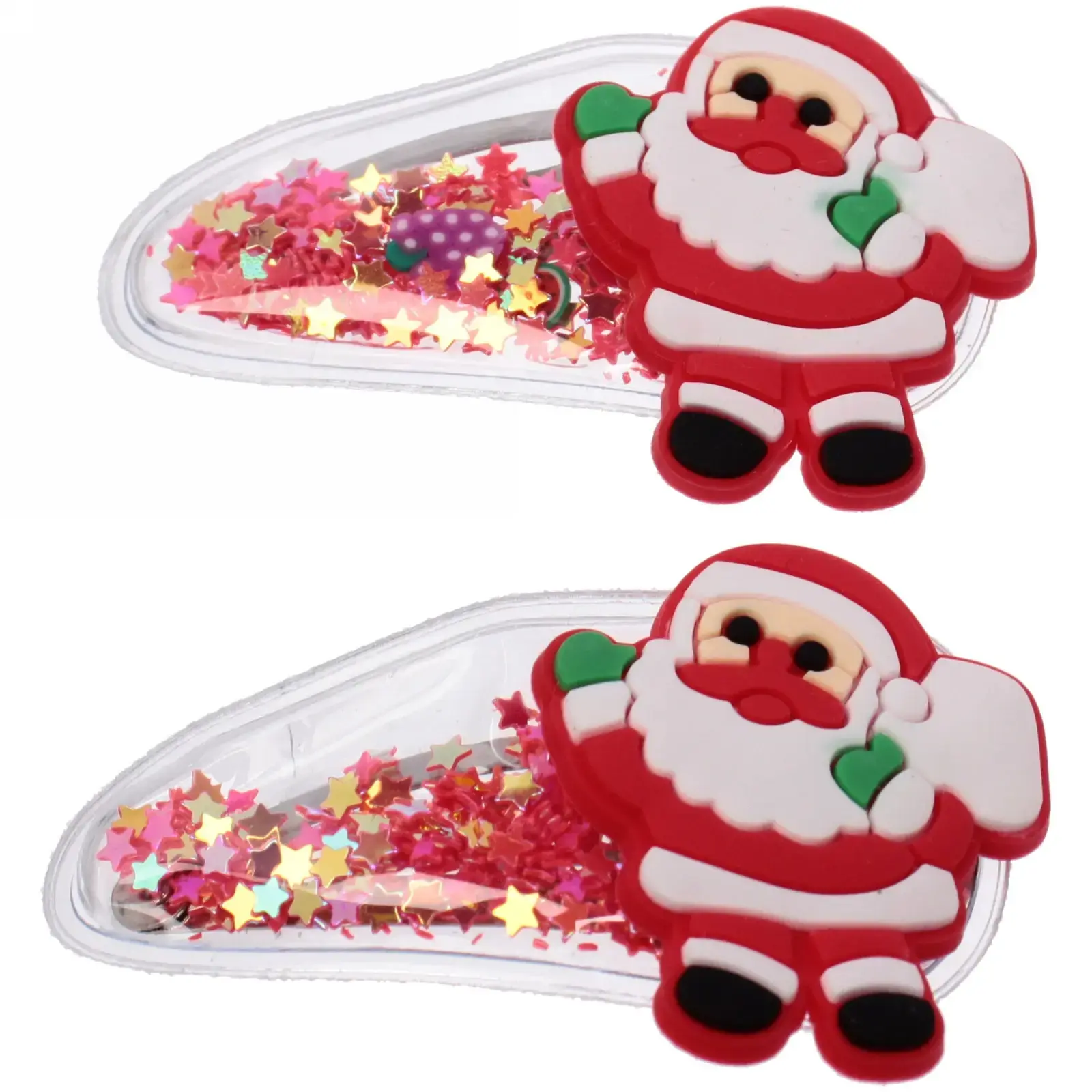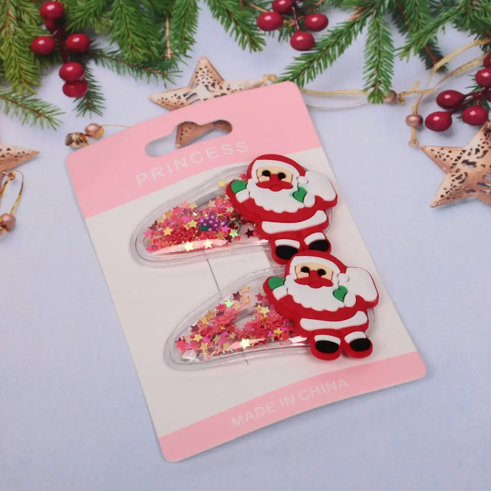 Каждая заколка изготовлена из прочного металла и пластика, что гарантирует длительный срок службы. Прозрачная основа с блёстками создает дополнительный декоративный эффект, а фигурка Деда Мороза станет настоящим украшением вашей причёски.