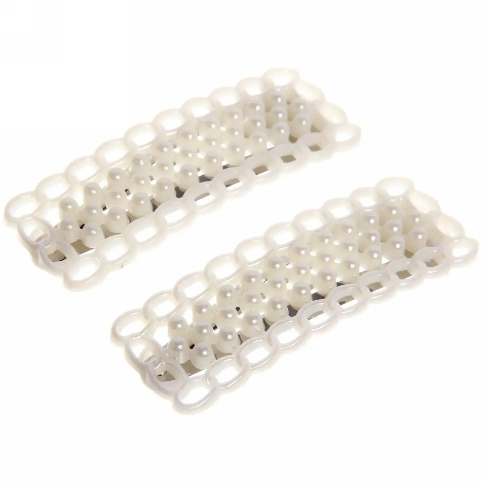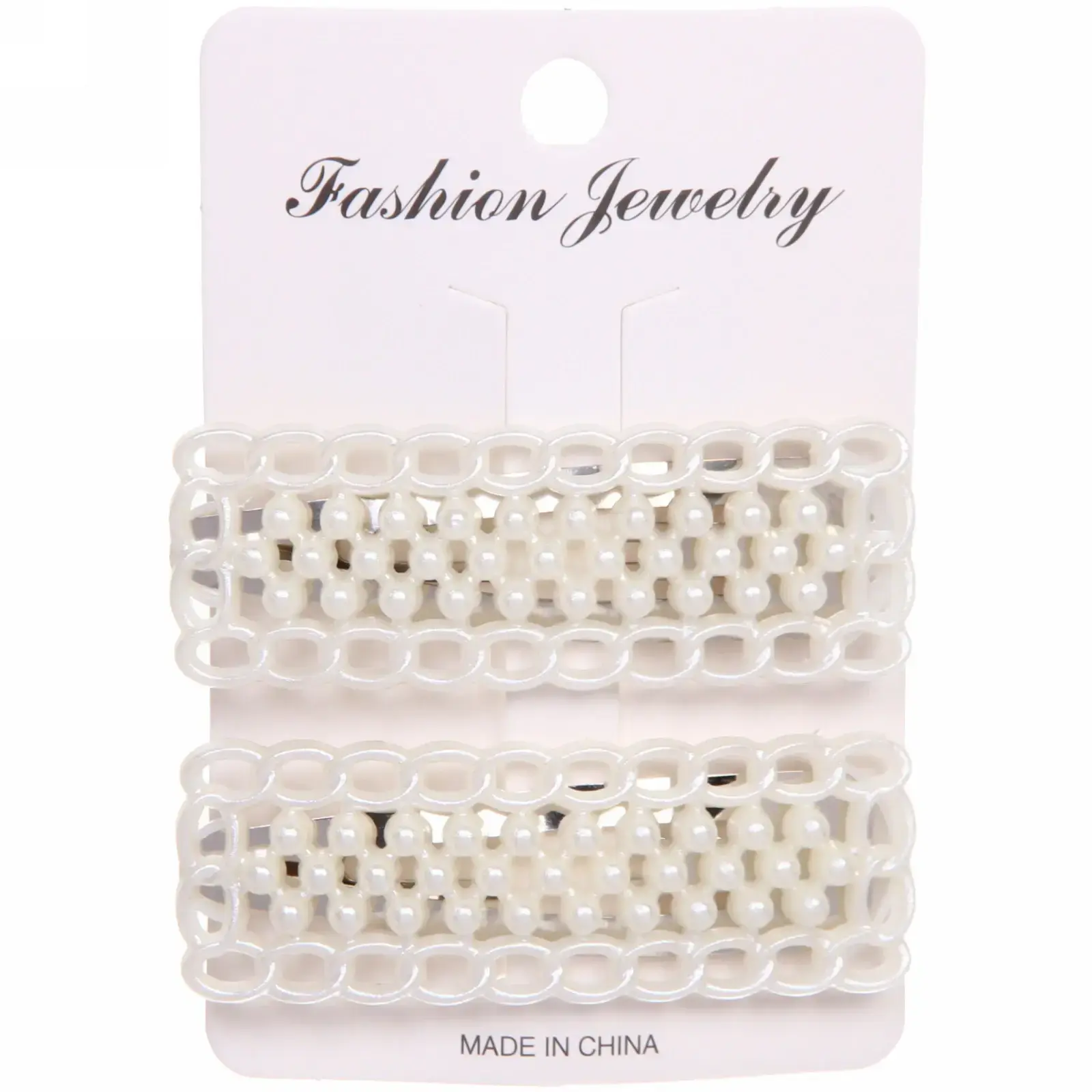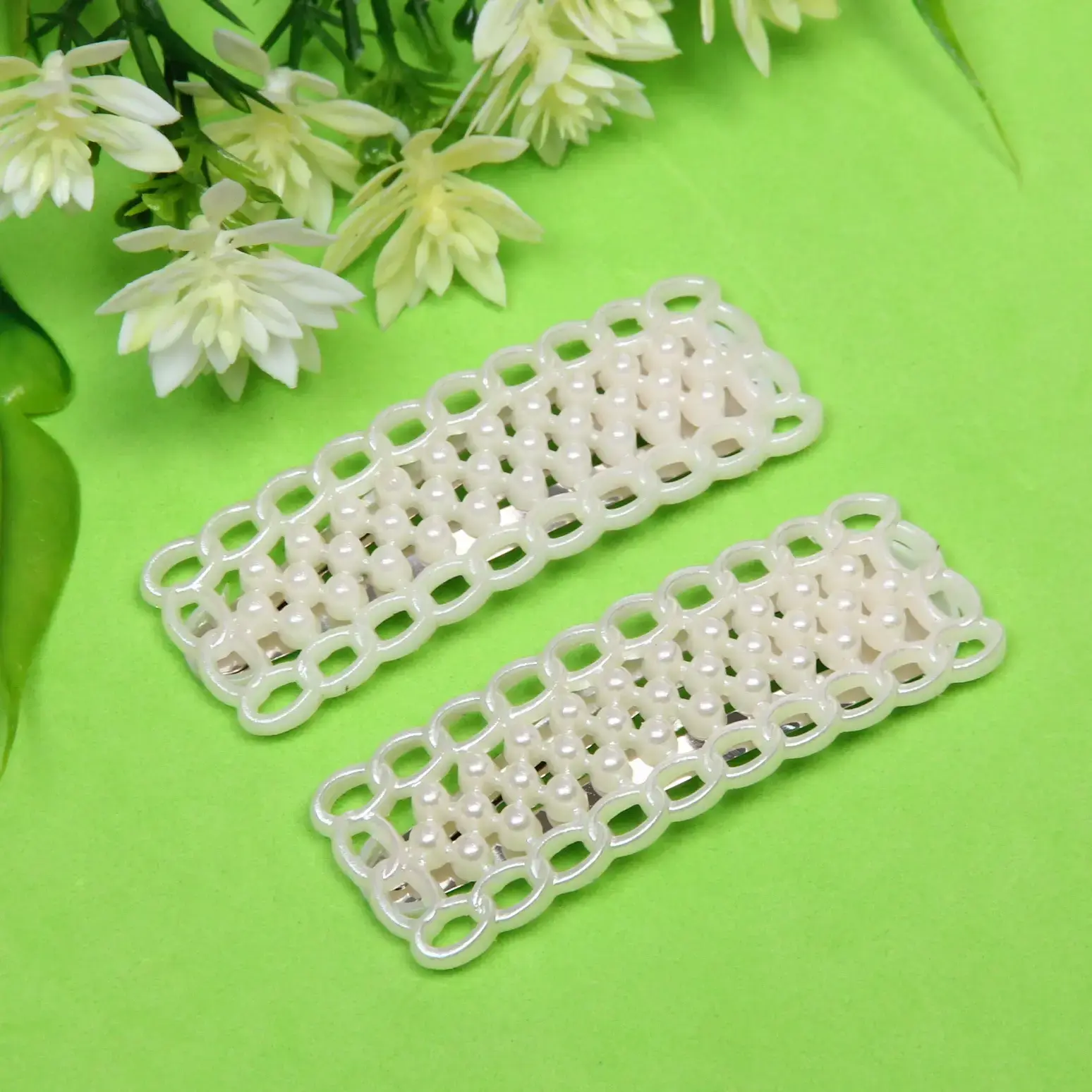 Комплект из двух зажимов позволяет экспериментировать с различными вариантами укладок. Прямоугольная форма обеспечивает равномерное распределение давления, не травмируя волосы. Белый цвет с перламутровым отливом гармонично сочетается с любым стилем одежды.