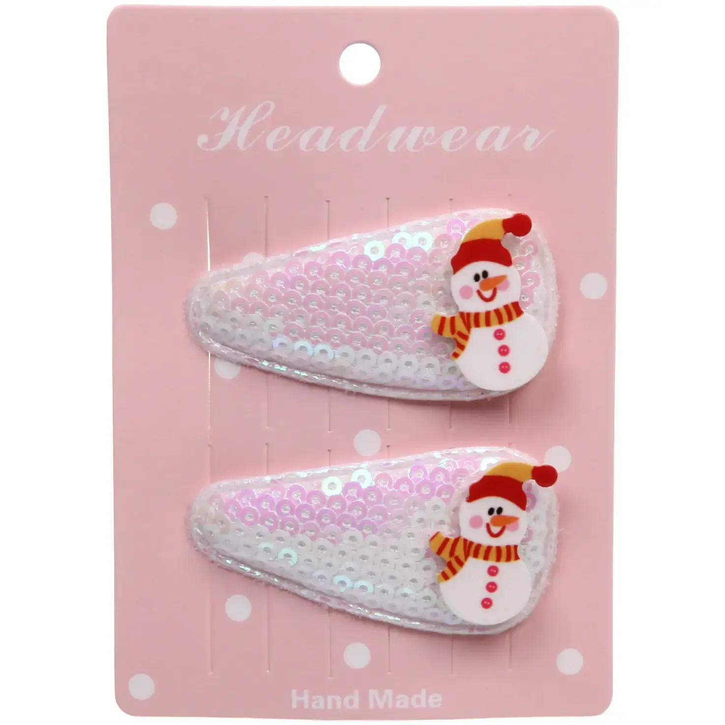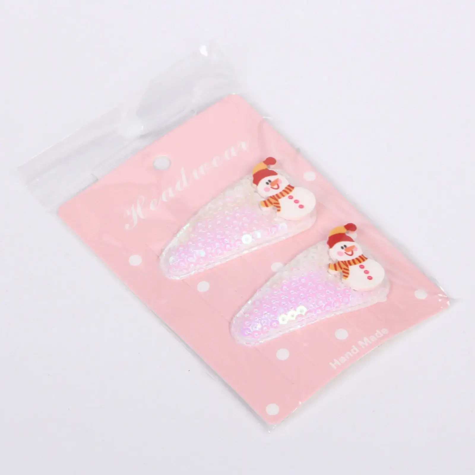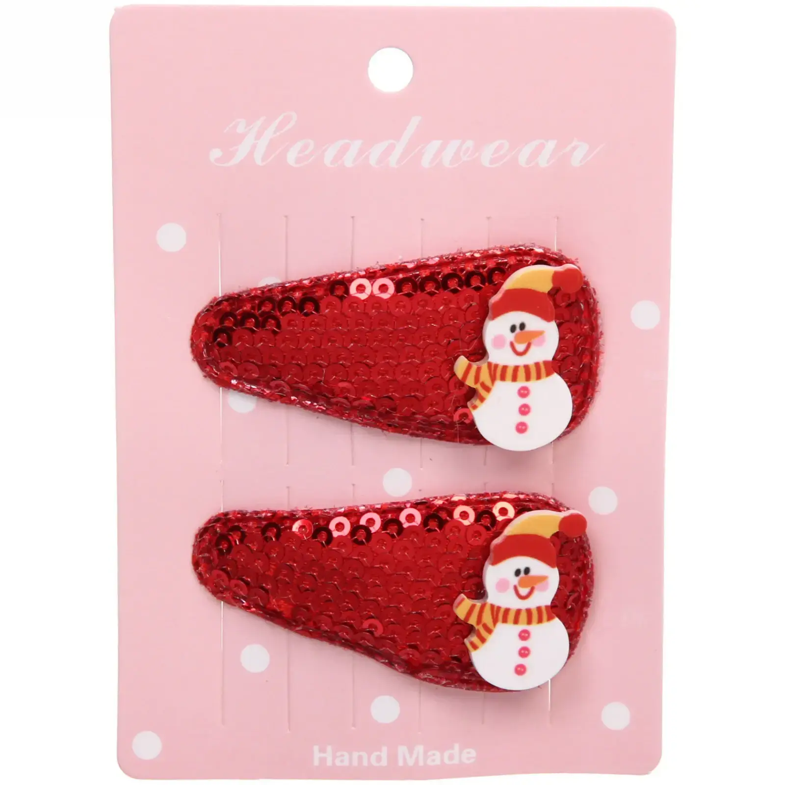 В комплект входят два зажима: один красного цвета с блестками и другой белого с перламутровым эффектом. Каждый зажим украшен милым снеговиком в красной шапке и шарфе, что делает их идеальными для зимнего сезона. Упаковка выполнена в розовом цвете с белыми горошками, что добавляет дополнительный шарм. Эти зажимы станут отличным подарком для друзей и близких, а также прекрасным дополнением к вашему новогоднему образу.