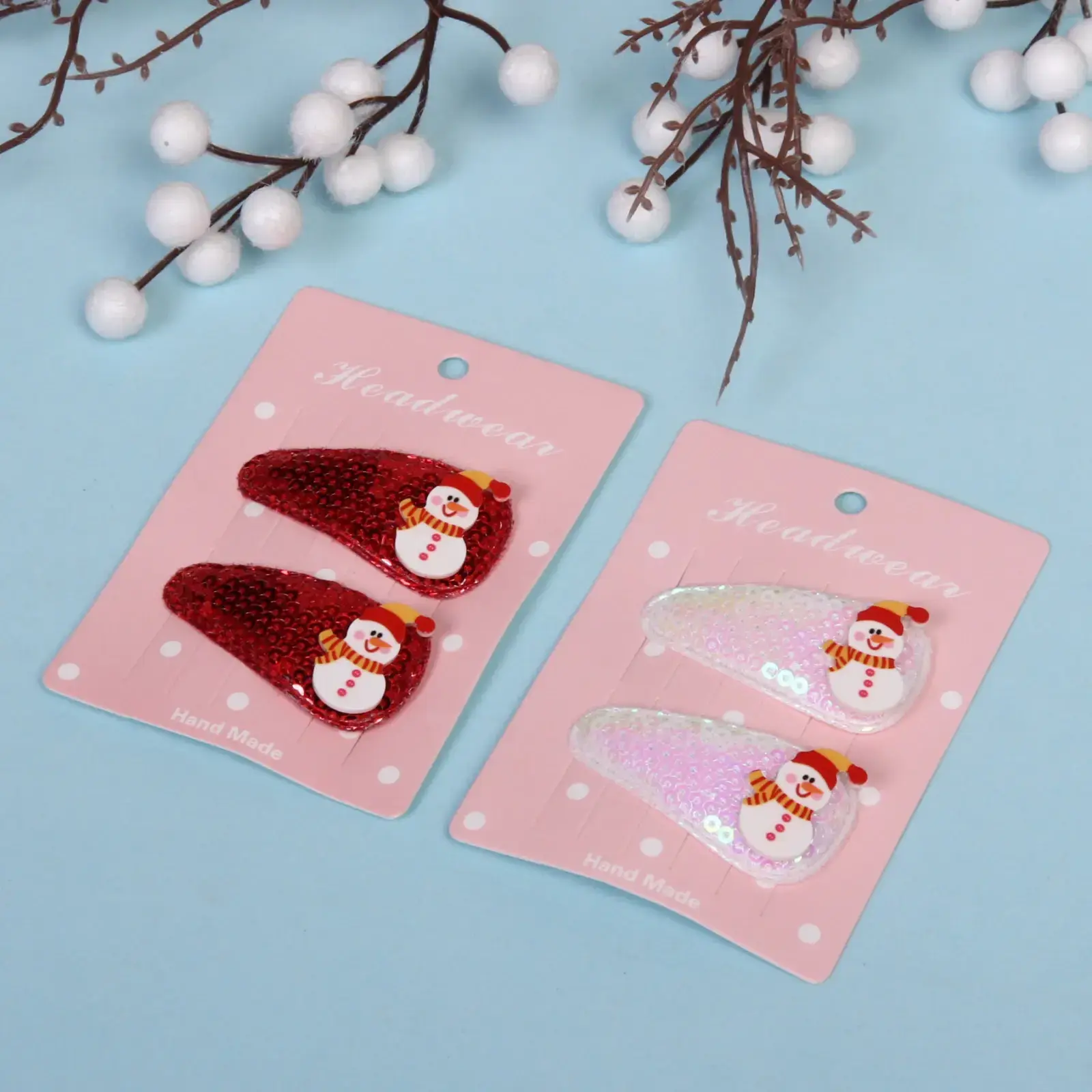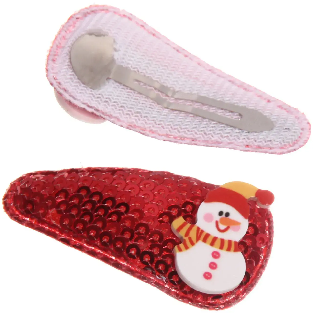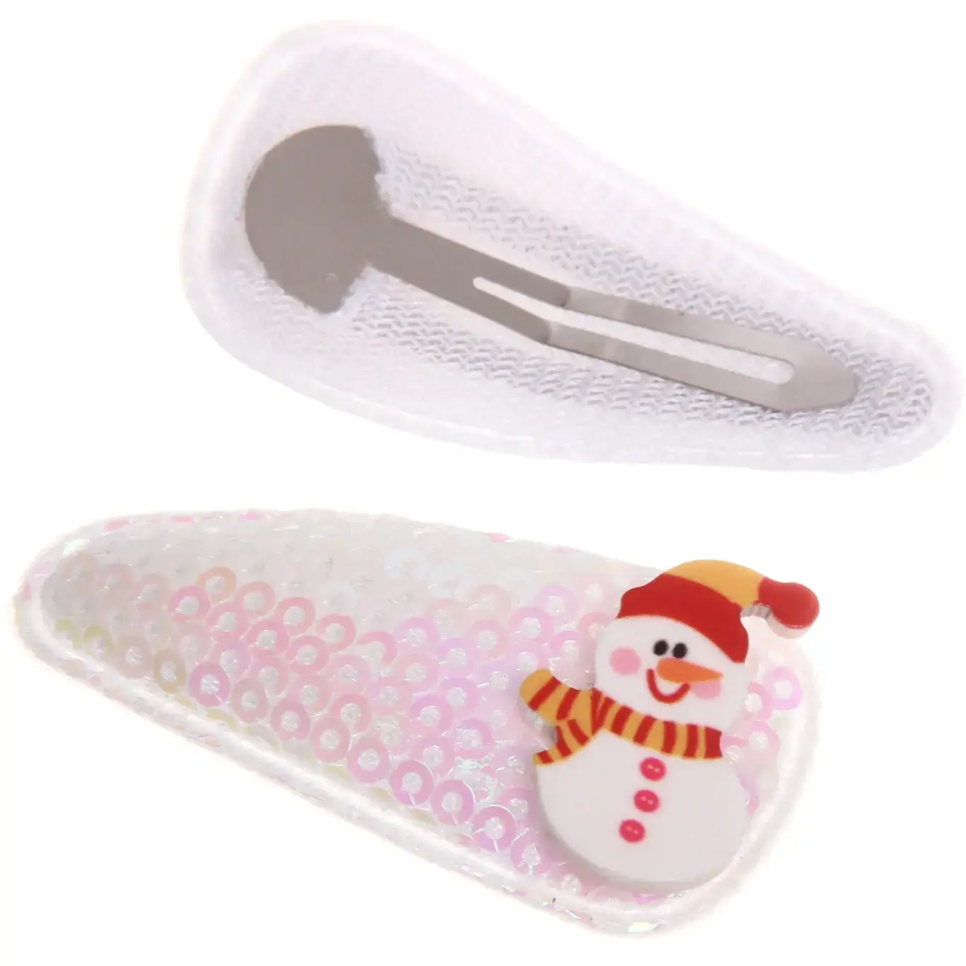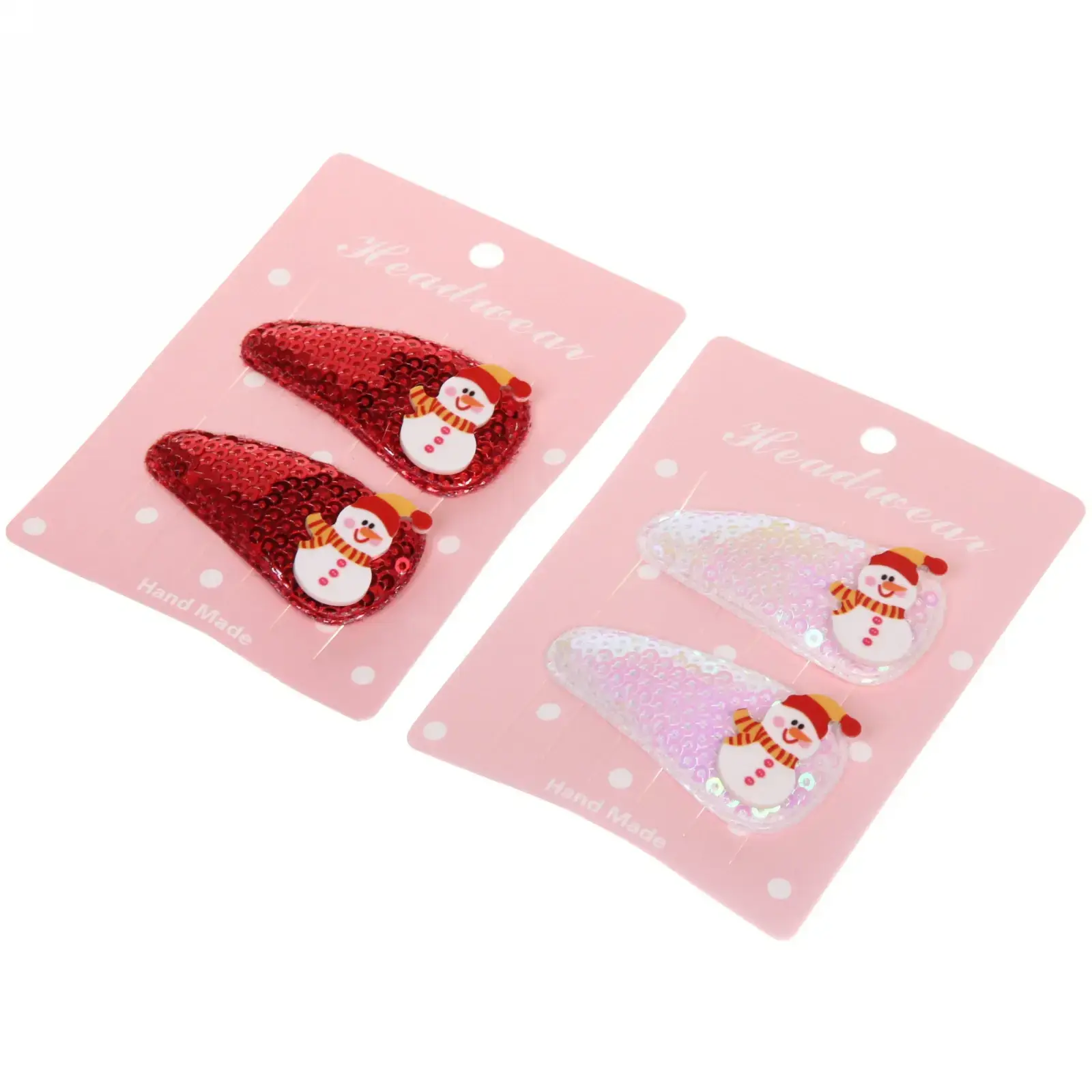 В комплект входят два зажима: один красного цвета с блестками и другой белого с перламутровым эффектом. Каждый зажим украшен милым снеговиком в красной шапке и шарфе, что делает их идеальными для зимнего сезона. Упаковка выполнена в розовом цвете с белыми горошками, что добавляет дополнительный шарм. Эти зажимы станут отличным подарком для друзей и близких, а также прекрасным дополнением к вашему новогоднему образу.