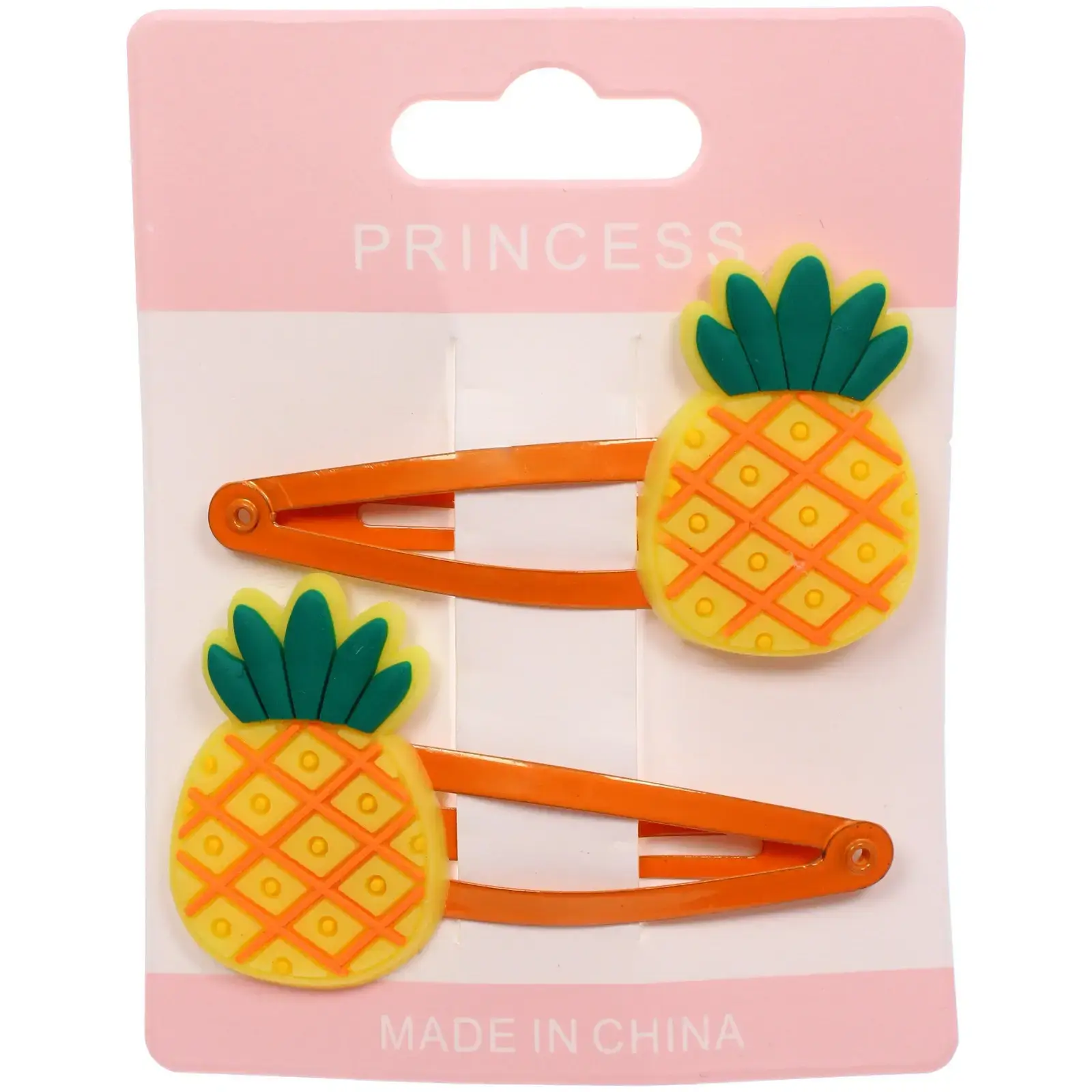 Размер зажимов составляет 5.5х1 см, что делает их удобными для использования на волосах любой длины. Яркие ананасы с зелеными листьями и оранжевым основанием создают веселый и жизнерадостный образ. Упаковка выполнена в светло-розовом цвете с надписью «PRINCESS», что делает их отличным подарком для маленьких принцесс.