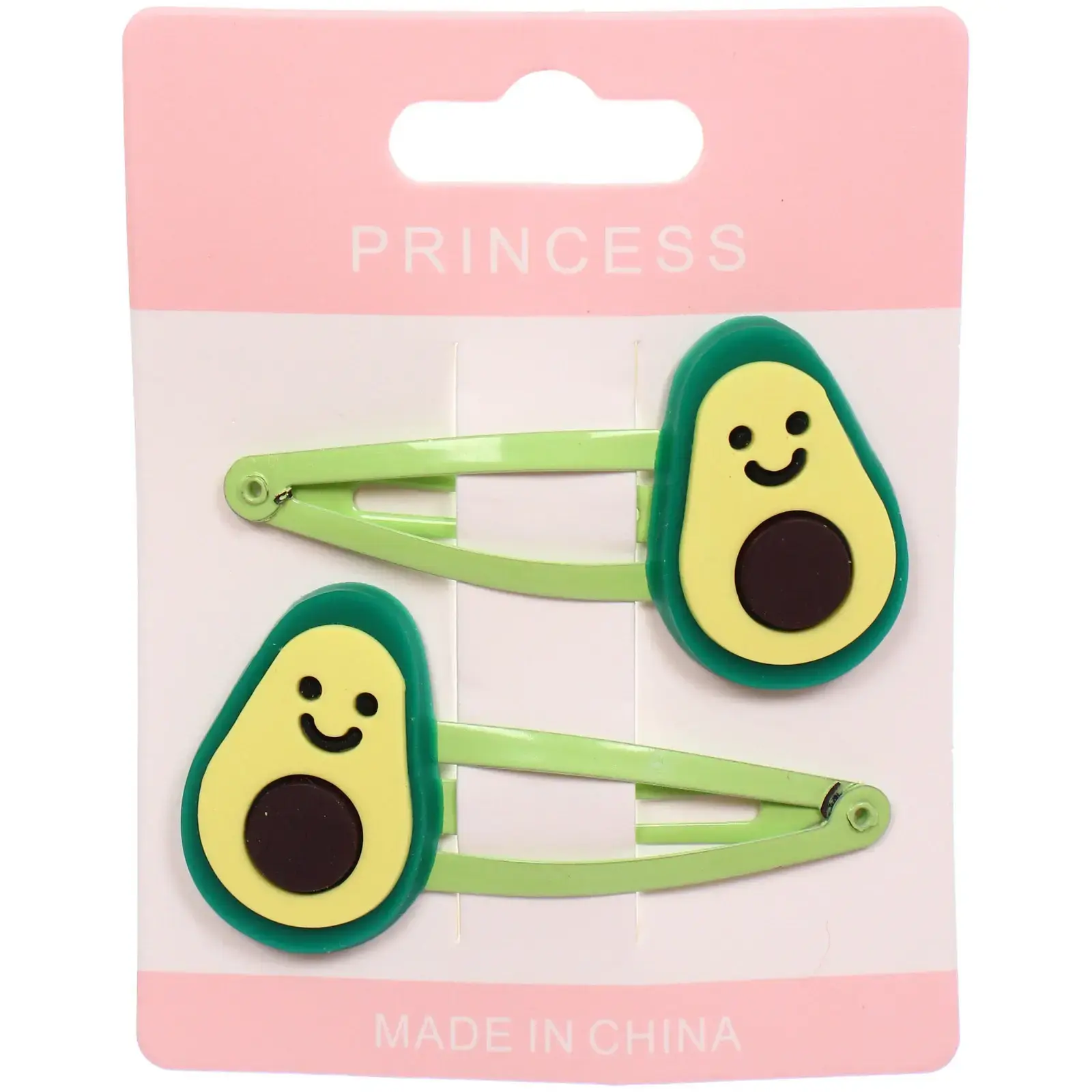 Размеры зажимов составляют 5.5х1 см, что делает их идеальными для маленьких детских волос. Каждый зажим имеет форму авокадо, с ярко-зеленым внешним слоем и светло-желтым внутренним, а также коричневой деталью, имитирующей косточку. Эти зажимы станут отличным аксессуаром для любого наряда.