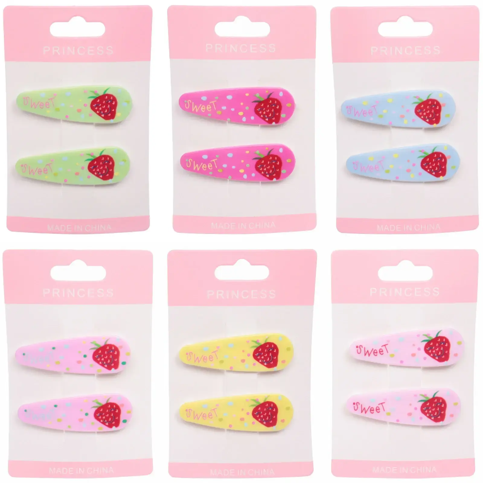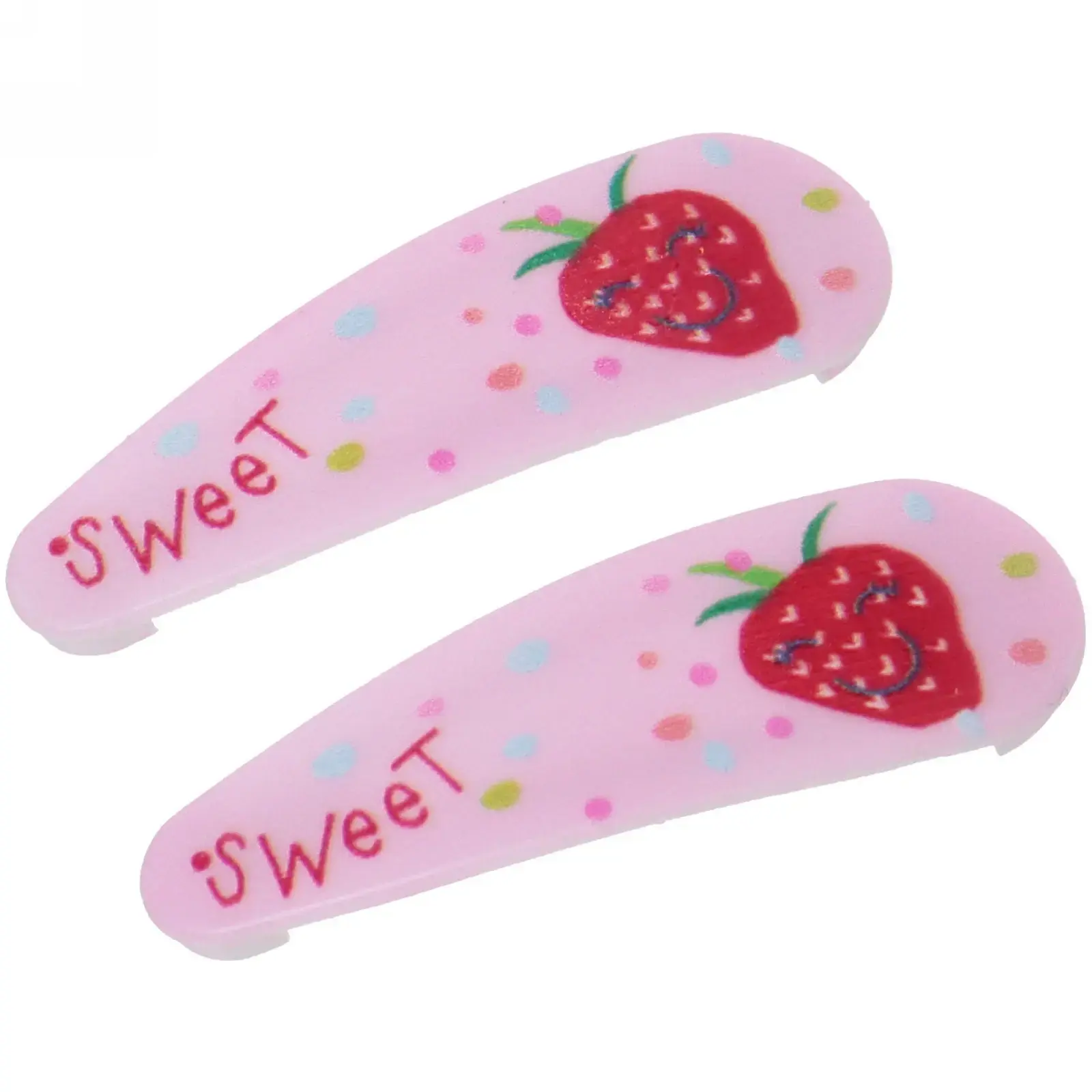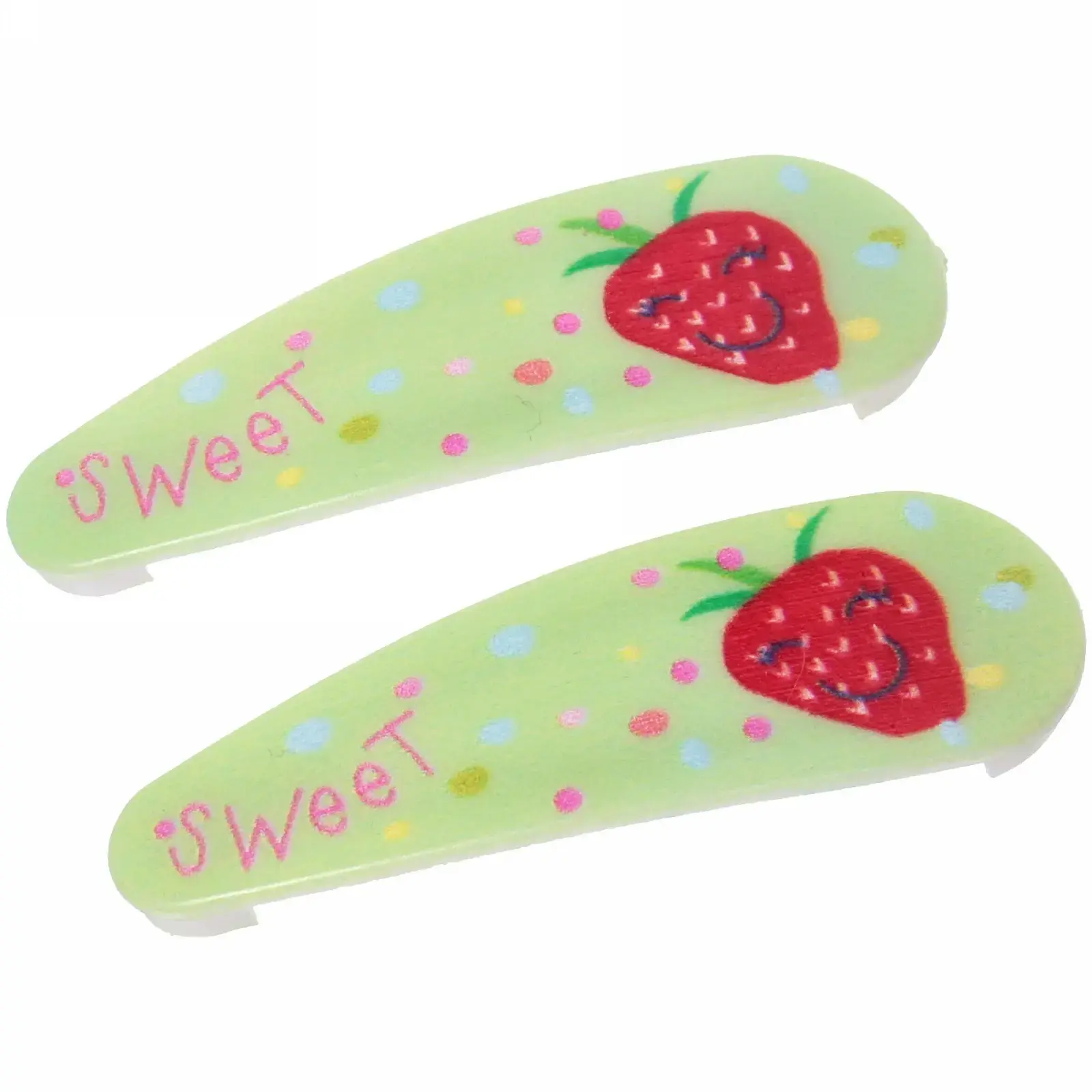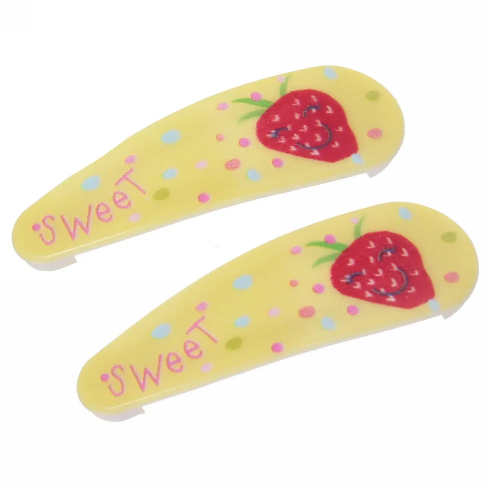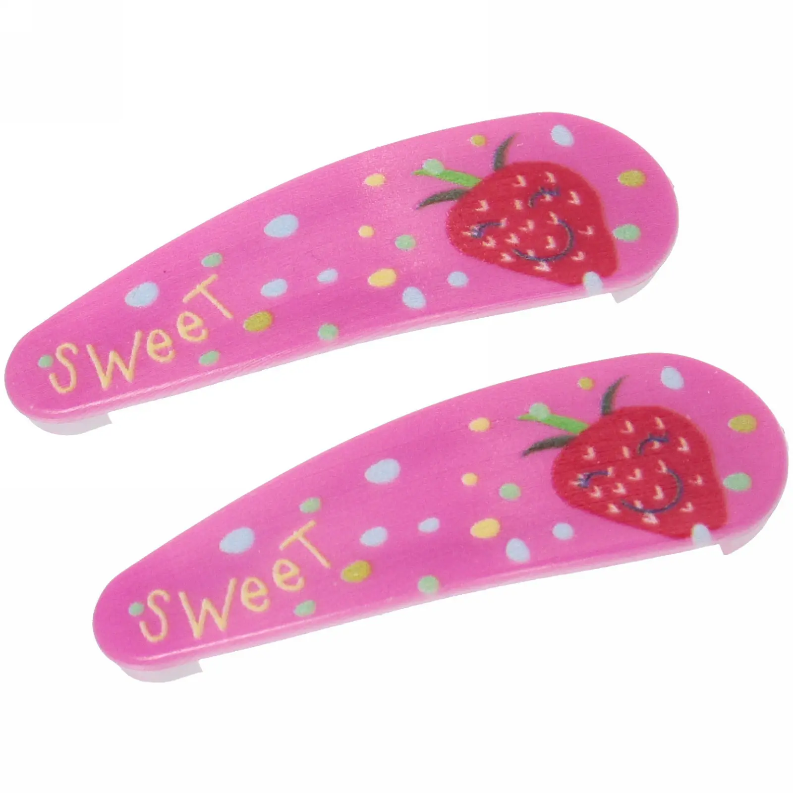 Каждый набор включает две заколки, выполненные в шести различных цветах, что позволяет легко сочетать их с любым нарядом. Изготовленные из качественных материалов, они обеспечивают долговечность и надежность. Яркие цвета и веселые рисунки в виде клубники и надписи «Sweet» делают их привлекательными для детей.
