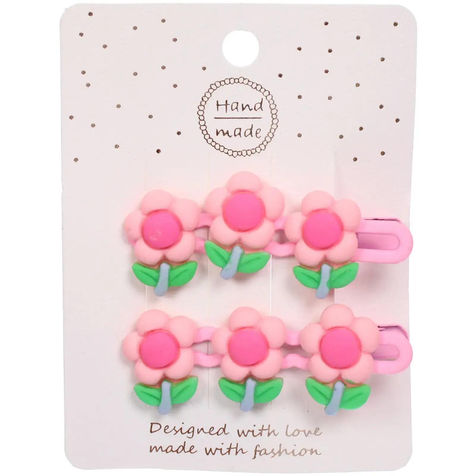 Каждый зажим имеет размер 2*5,5 см, что делает их компактными и удобными для хранения. Цветочки выполнены в нежных розовых тонах с зелеными листьями, что добавляет им очарования. Упаковка в блистере обеспечивает защиту заколок и удобство при транспортировке.