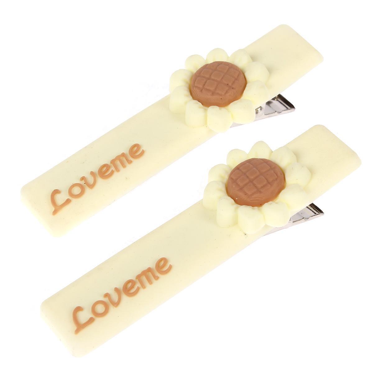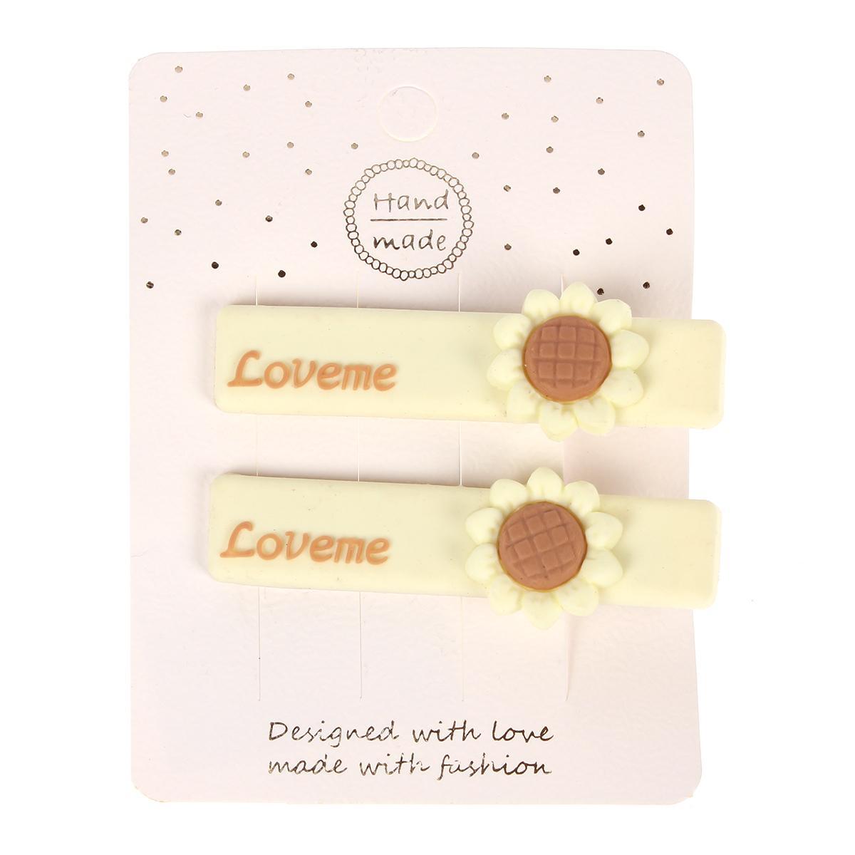 Заколки выполнены в белом цвете и украшены желтым цветком с коричневым центром, что придает им особый шарм. Каждая заколка имеет надпись "Loveme", что добавляет индивидуальности. Эти аксессуары станут отличным подарком для девочек, которые любят экспериментировать со своим стилем.