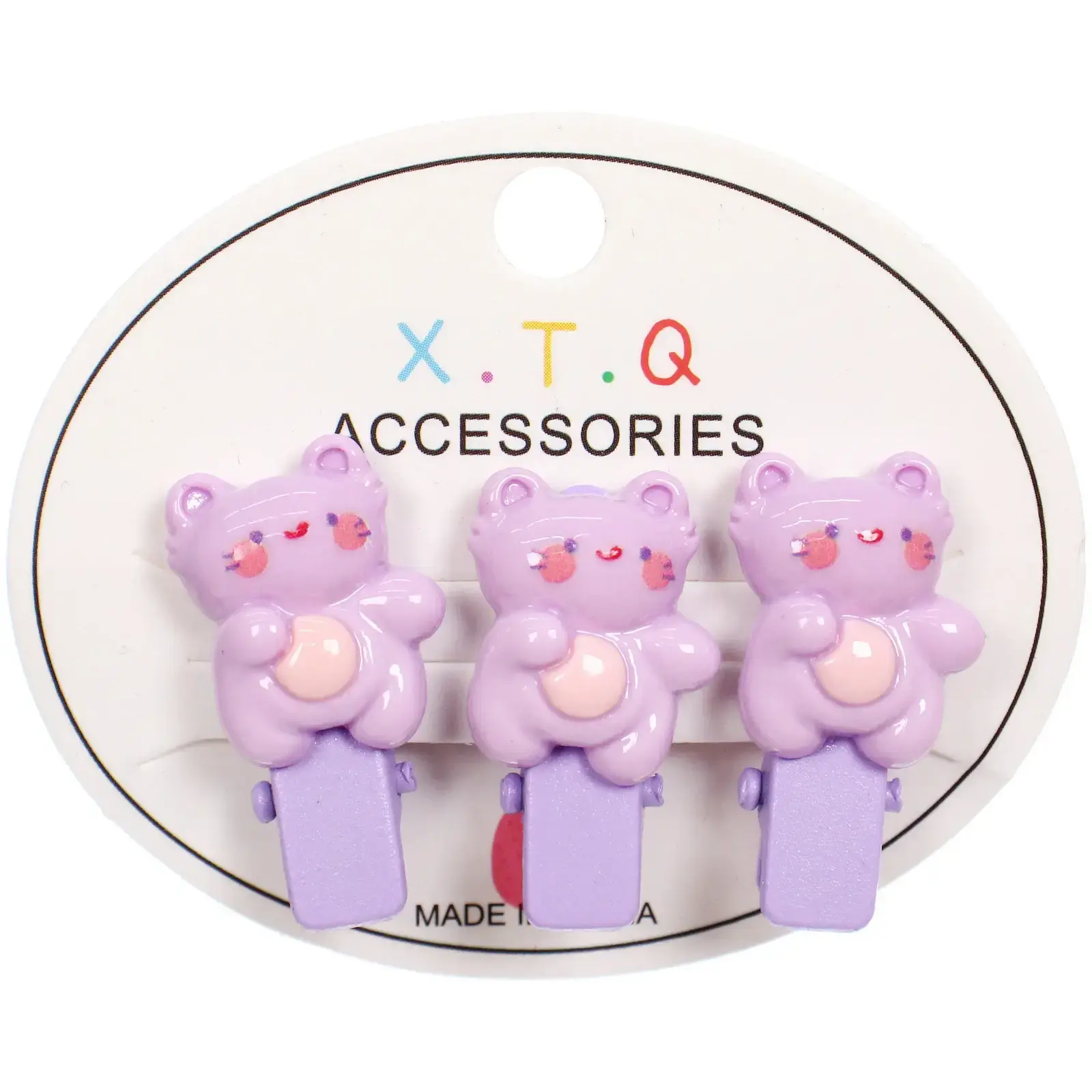 Каждый зажим выполнен в фиолетовом цвете и имеет форму медвежонка с крупными ушами и улыбающимся лицом. Упаковка включает три заколки, которые удобно хранить в блистере с подвесом. Эти заколки станут отличным подарком для девочек и добавят ярких красок в их повседневный стиль.