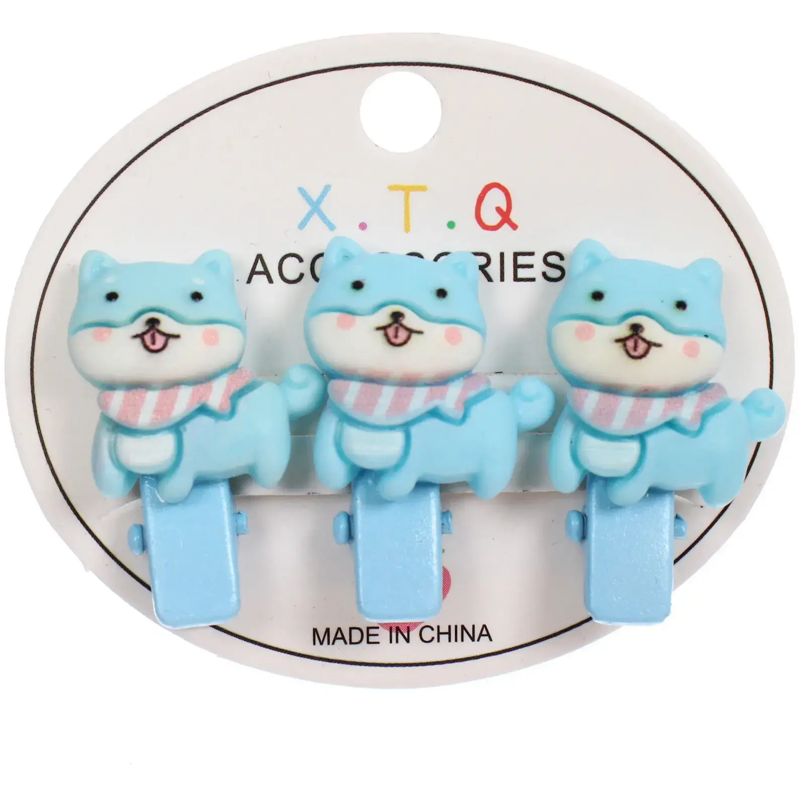 Каждый зажим выполнен в форме собаки с улыбающимся лицом и шарфом, что добавляет игривости в образ. Упаковка включает три зажима, что позволяет менять их в зависимости от настроения и наряда. Зажимы представлены в светлом голубом цвете с белыми и розовыми элементами, что делает их универсальными для сочетания с различными стилями одежды.