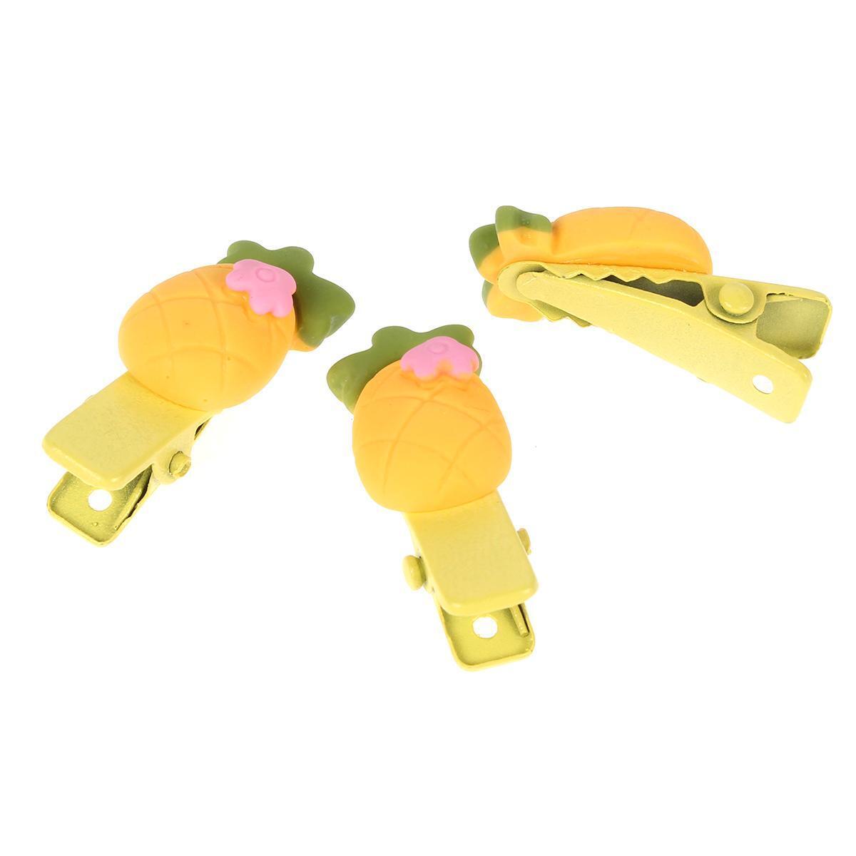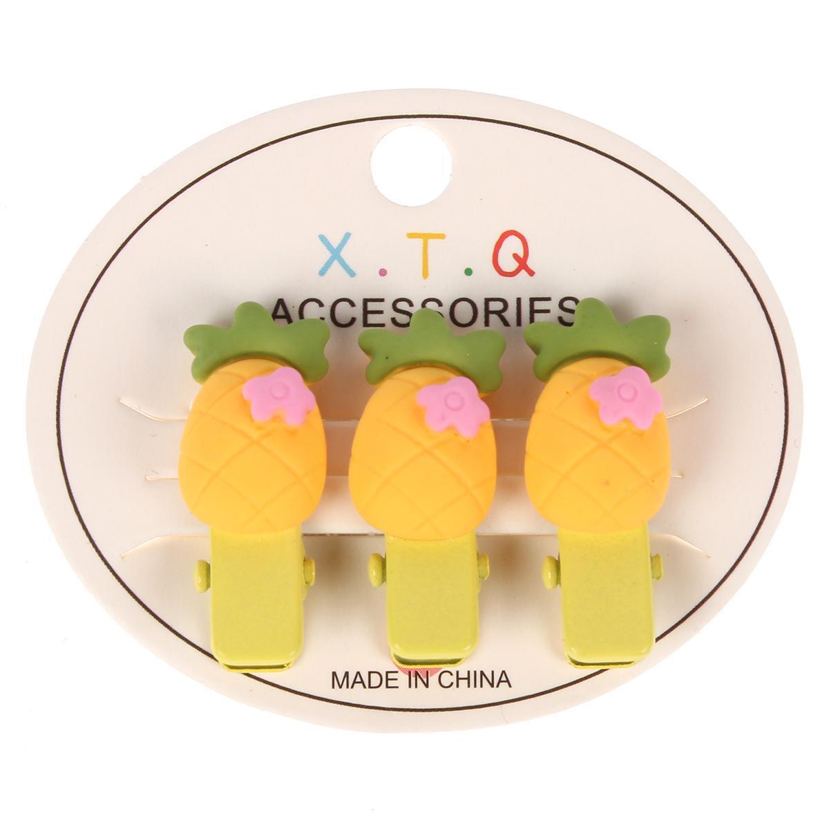 Эти компактные зажимы для волос созданы специально для малышей и девочек, которые любят яркие аксессуары. В набор входит 3 зажима в стиле ананасов, выполненных из прочного пластика с ярким желтым цветом и зелёными листьями, украшенными розовыми цветочками. Размер каждого зажима — 2.5 см, что идеально подходит для использования в детской шевелюре. Легко закрепляются и держат волосы идеально без повреждений.