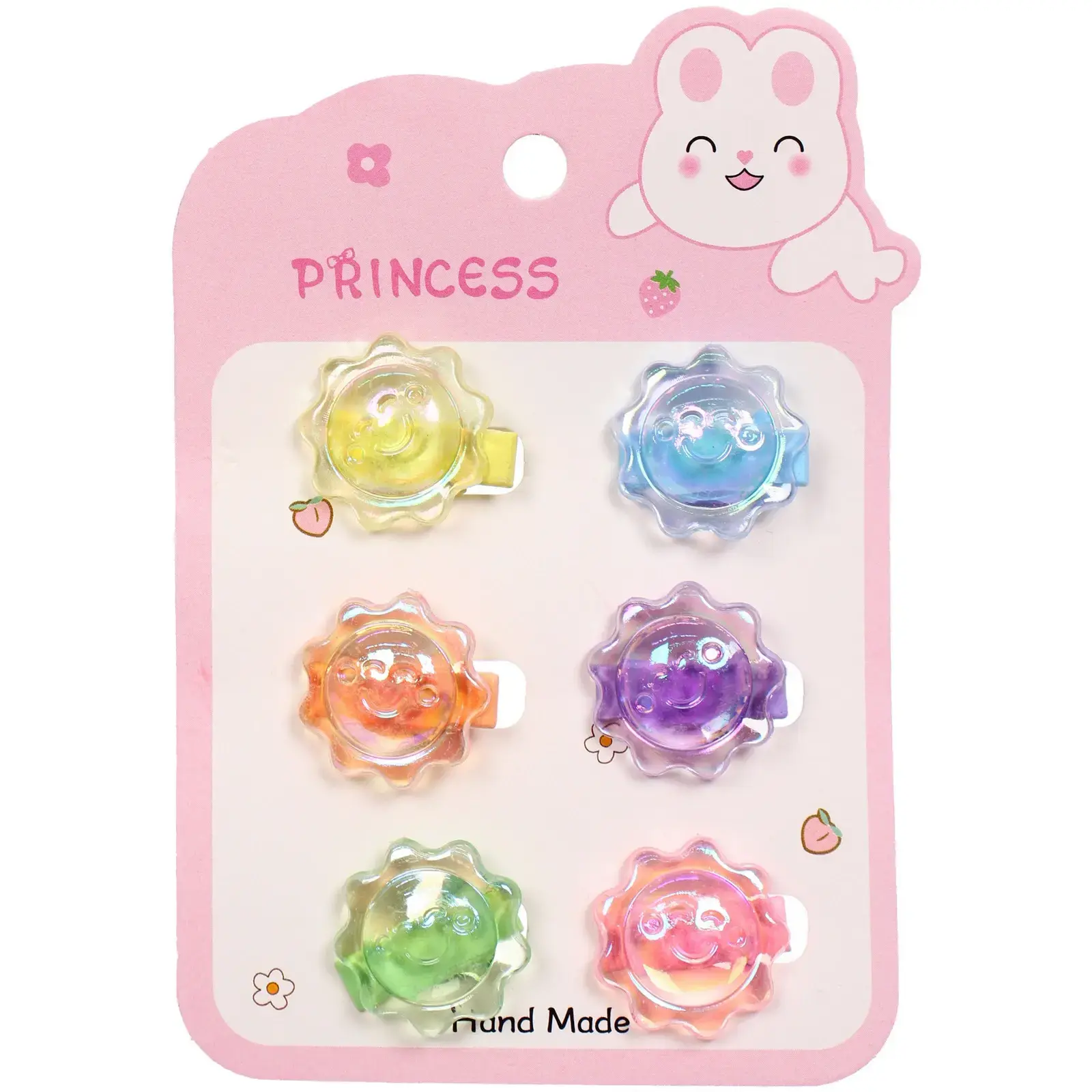 Размеры зажимов составляют 2.5 см, что делает их идеальными для маленьких волос. Упаковка выполнена в розовом цвете с изображением улыбающегося кролика и надписью «PRINCESS», что добавляет дополнительный шарм. Яркие заколки легко чистятся и не теряют своего блеска со временем, что делает их отличным выбором для активных детей.