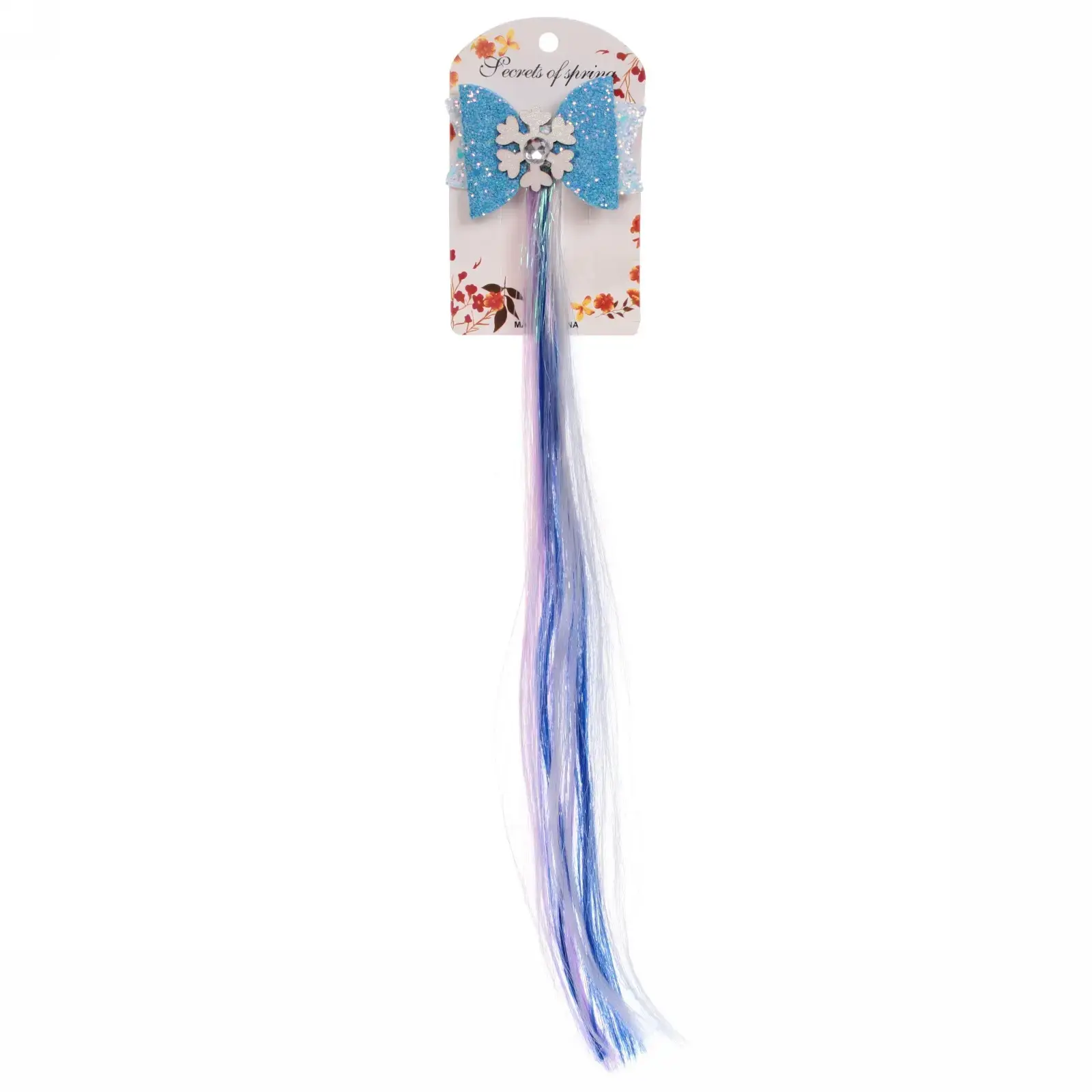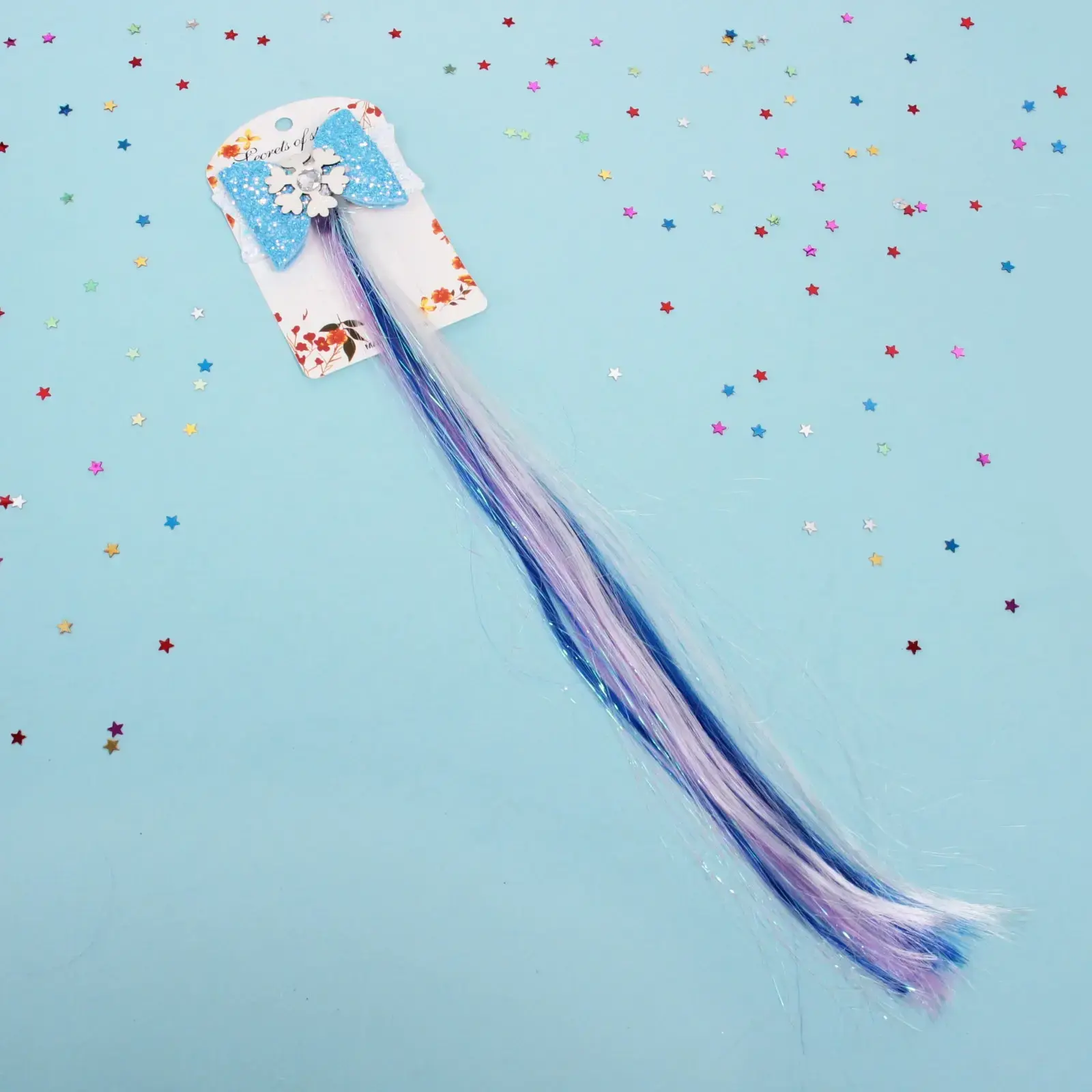 Конструкция: металлический зажим с декоративным бантом (40х10см) и прядями с градиентом от голубого к фиолетовому. Материалы: металл, ПВХ с блестящим покрытием.