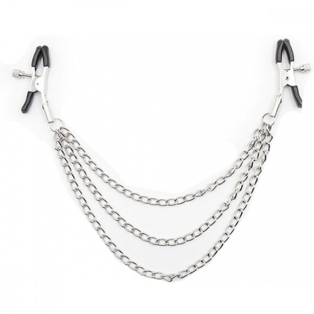Эти изящные зажимы на соски, объединенные тремя цепочками, подарят вам неповторимые ощущения комфорта и возбуждения, добавляя остроты в ваши личные моменты. Серебристый цвет и металлический блеск сделают аксессуар стильным дополнением к вашим играм, помогая усилить эмоции и наслаждение.