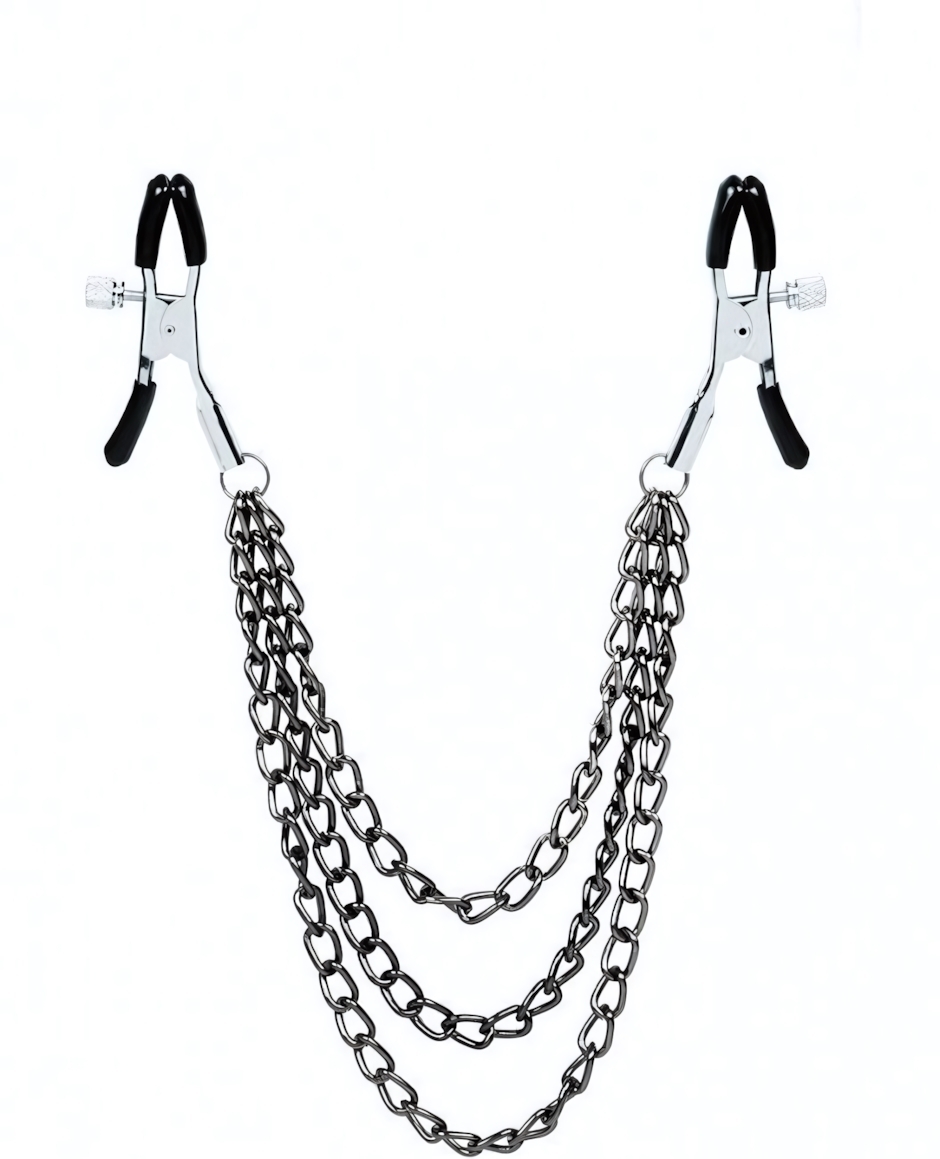 Металлические зажимы с тройной цепочкой созданы для пар, которые ценят эстетику и комфорт в интимных моментах. Изысканное сочетание черного матового покрытия с серебристыми акцентами добавит эротической изюминки вашим отношениям.