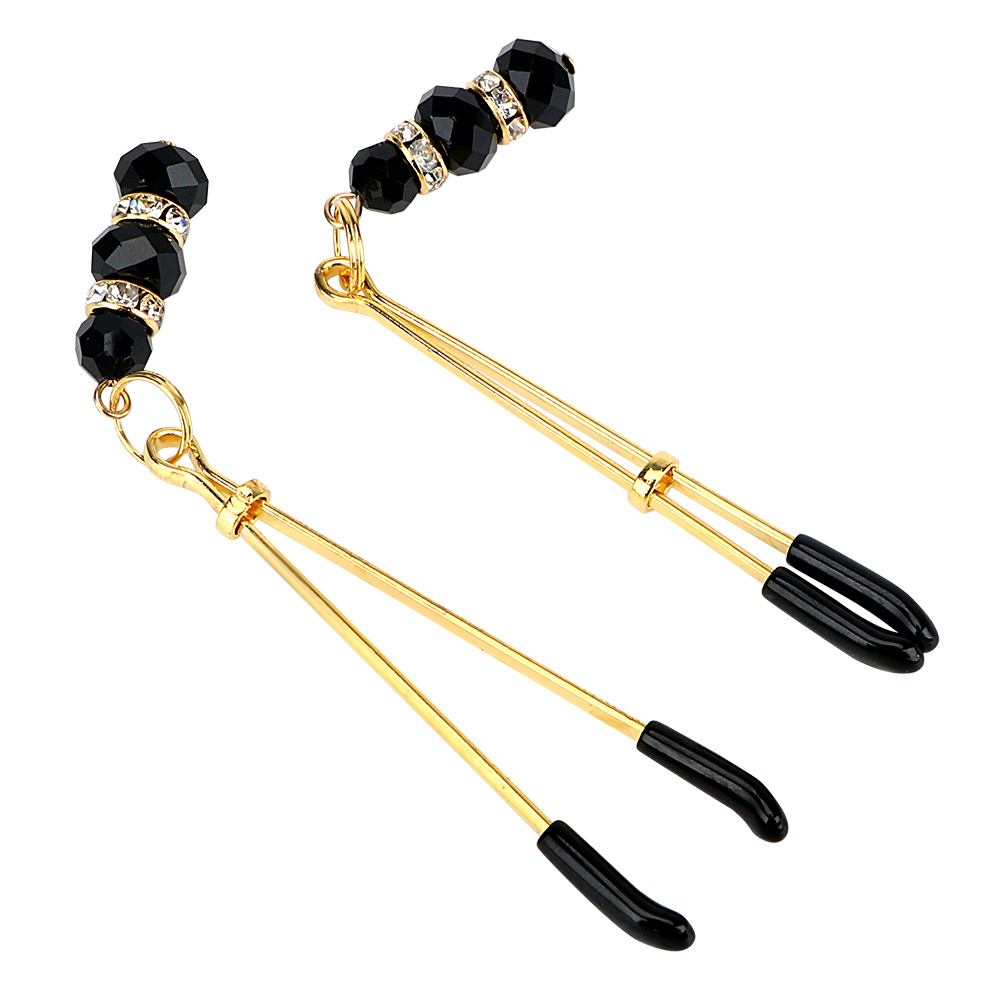 Размер зажимов составляет 10 см в длину, что делает их удобными для ношения и использования. Золотистый цвет с черными бусинами добавляет элегантности и стиля, а резиновые наконечники обеспечивают комфорт при ношении. Эти зажимы станут отличным выбором для тех, кто хочет добавить немного пикантности в свою жизнь.