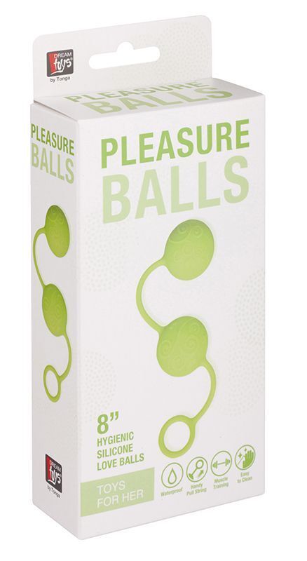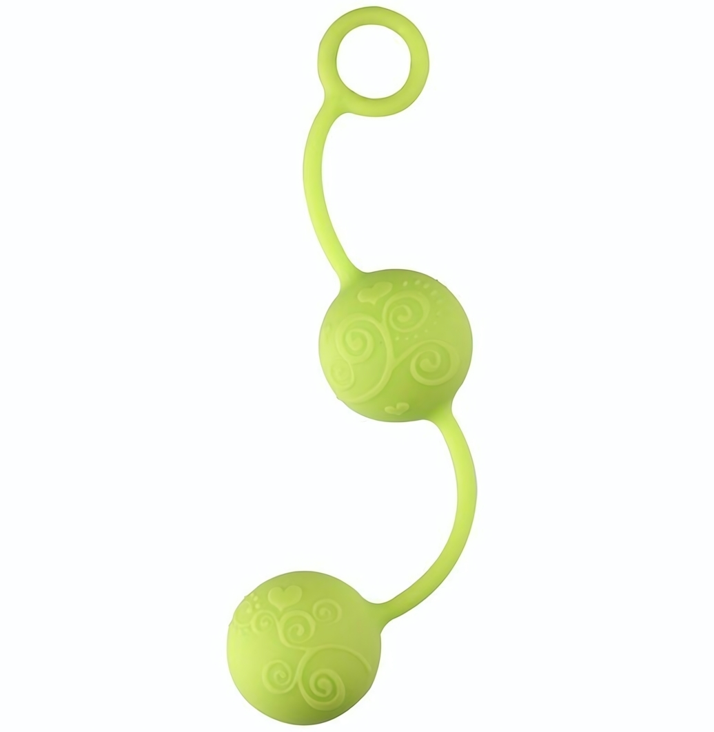 Цвет шариков — ярко-зеленый, что добавляет игривости в их использование. Они имеют гладкую поверхность с узорами в виде спиралей и сердечек, что делает их не только функциональными, но и привлекательными. Удобное кольцо на одном из шариков позволяет легко управлять ими во время использования.