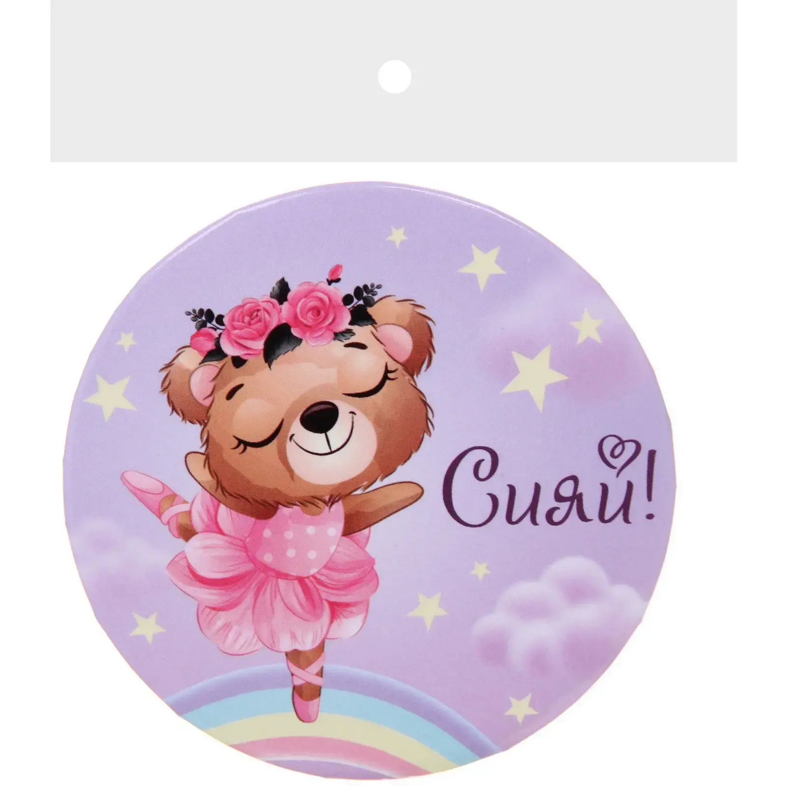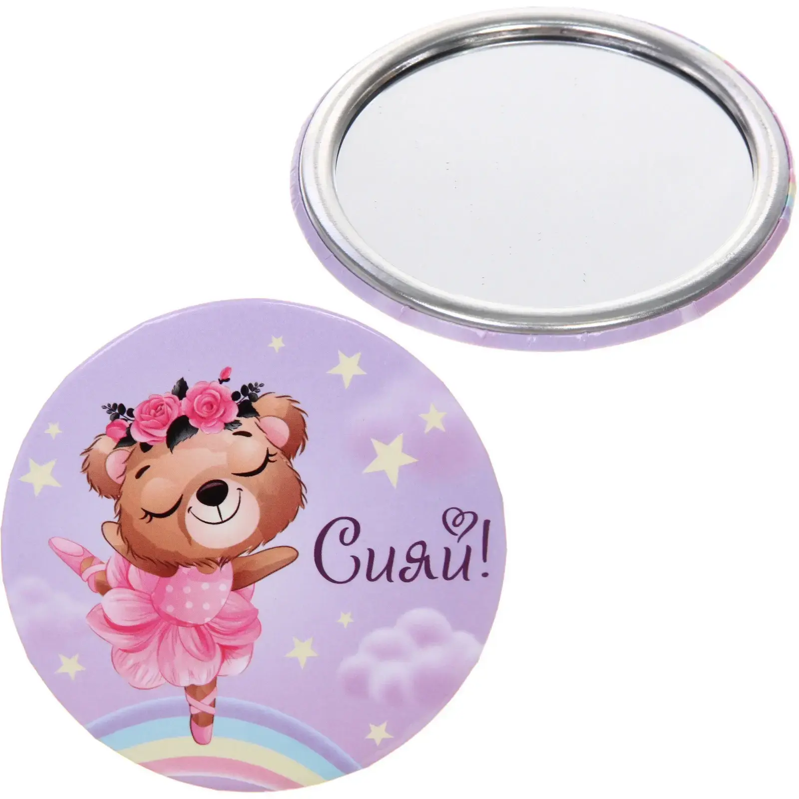 Зеркало имеет гладкую металлическую рамку, что придает ему элегантный вид. Декоративная сторона оформлена в светло-лавандовых тонах с изображением медвежонка, что делает его идеальным подарком для детей и подростков. Упаковка с подвесом позволяет удобно хранить и демонстрировать зеркало.