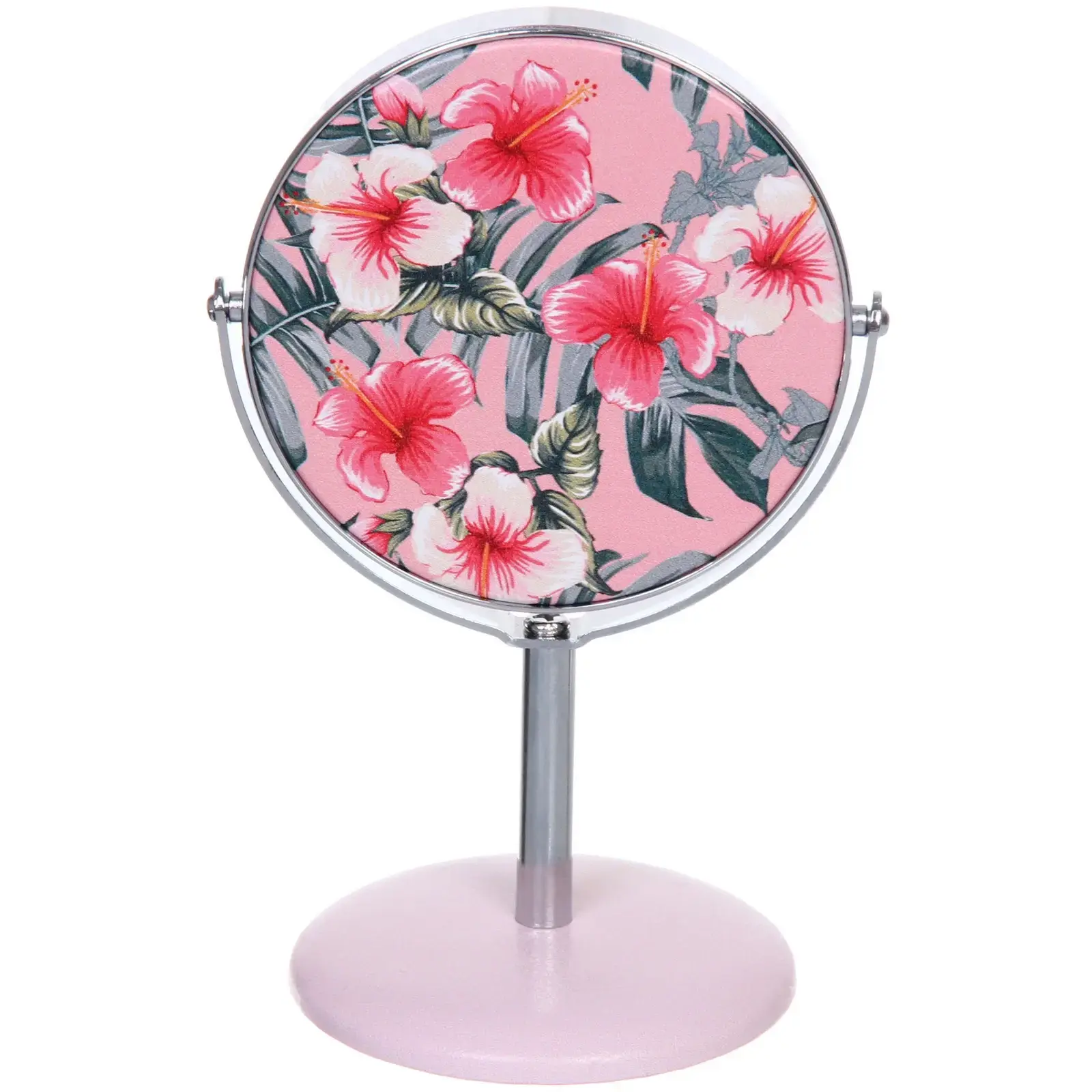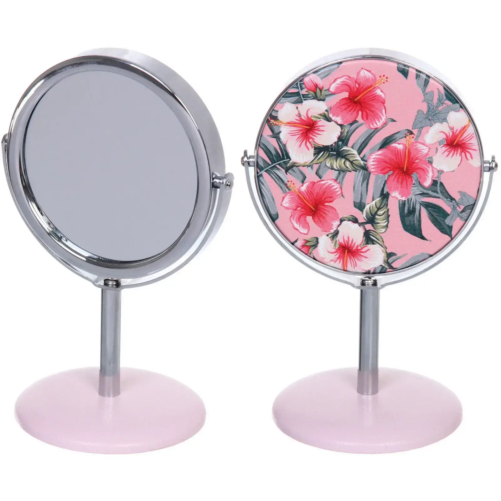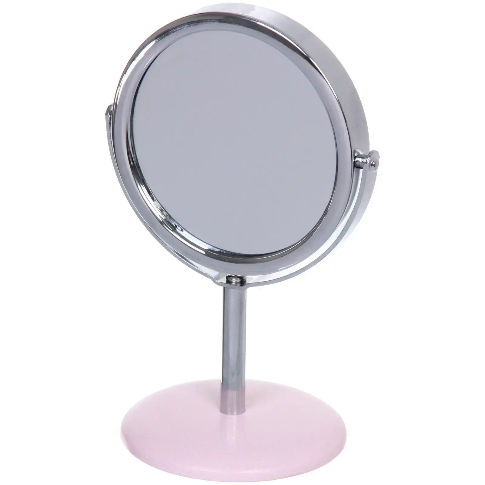 Зеркало имеет круглую форму и установлено на устойчивой вертикальной подставке светло-розового цвета. Оно идеально подходит для макияжа, личной гигиены и ухода за внешностью. Благодаря поворотному механизму, вы можете легко изменять угол наклона зеркала, что делает его использование максимально удобным.