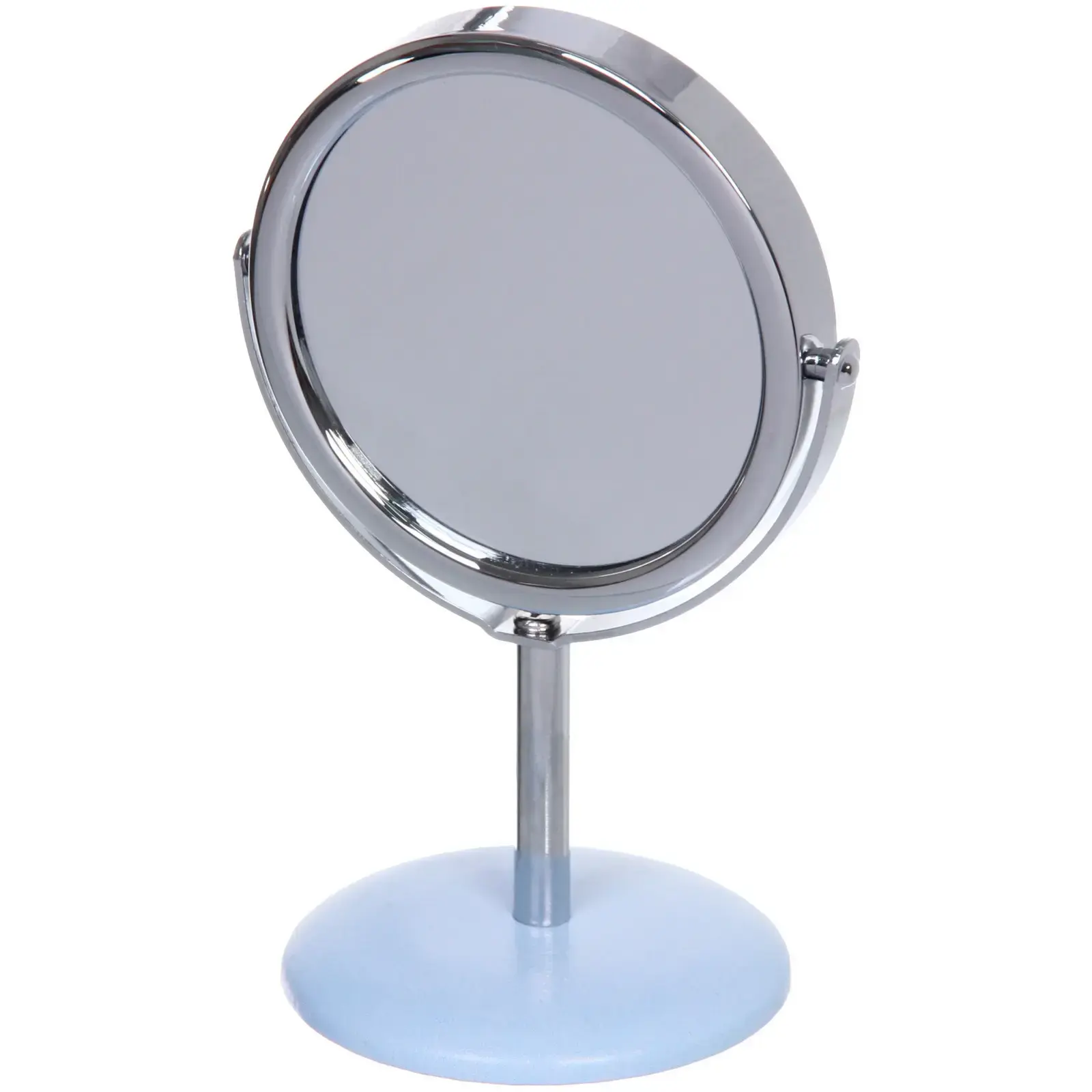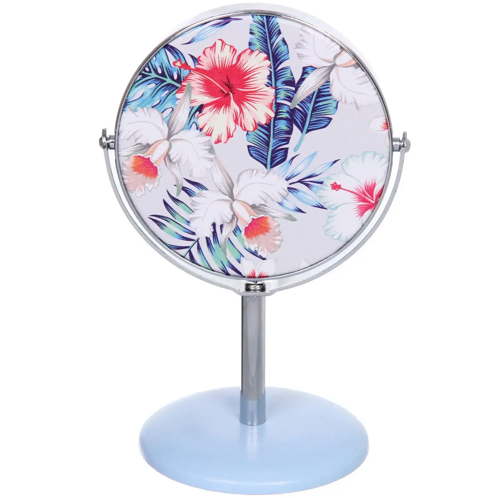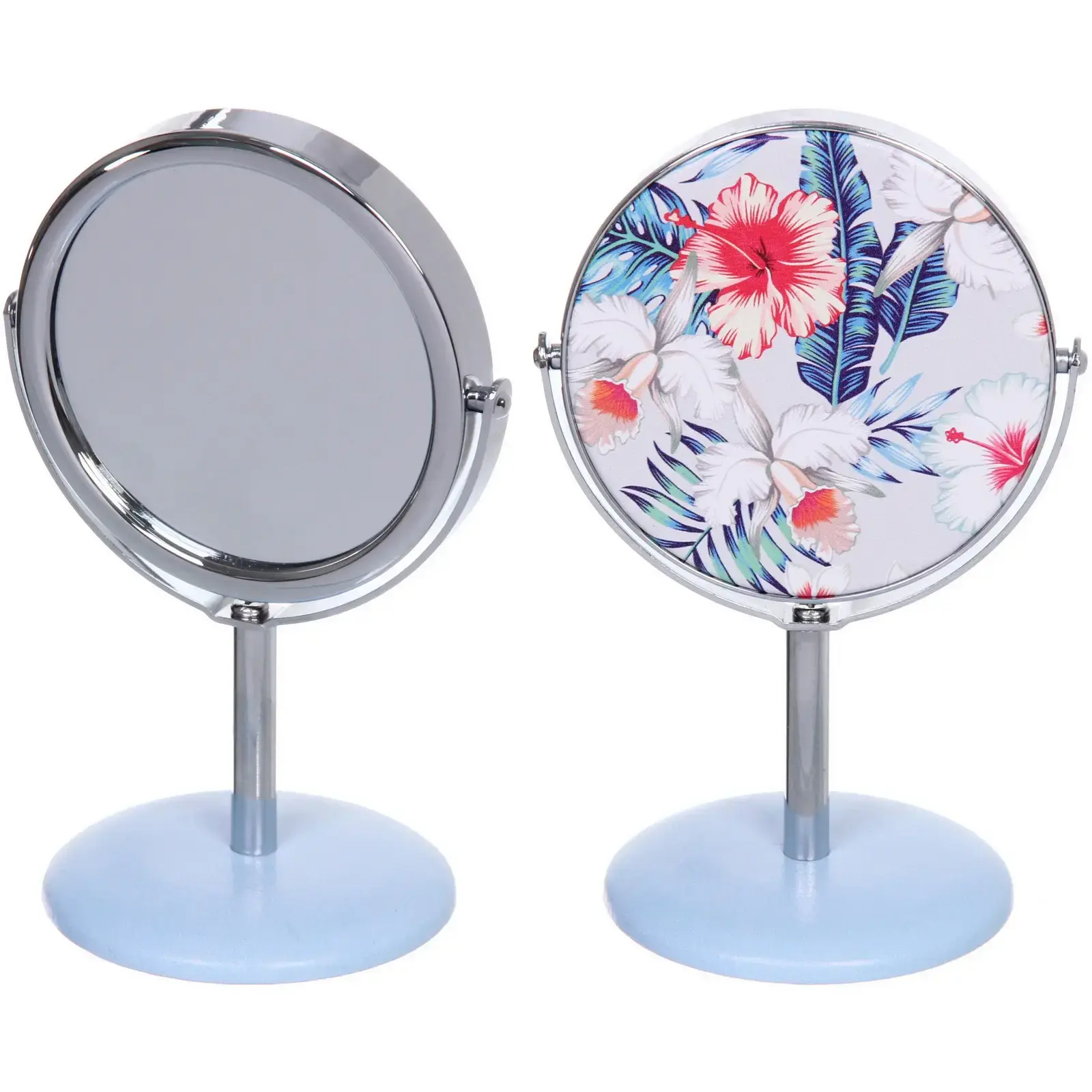 Это зеркало идеально подходит для использования на столе или косметическом столике. Оно имеет круглую форму и установлено на устойчивой подставке светло-голубого цвета, что делает его не только практичным, но и стильным элементом декора. Одна сторона зеркала отражает изображение, а другая оформлена в цветочных узорах, что добавляет оригинальности.