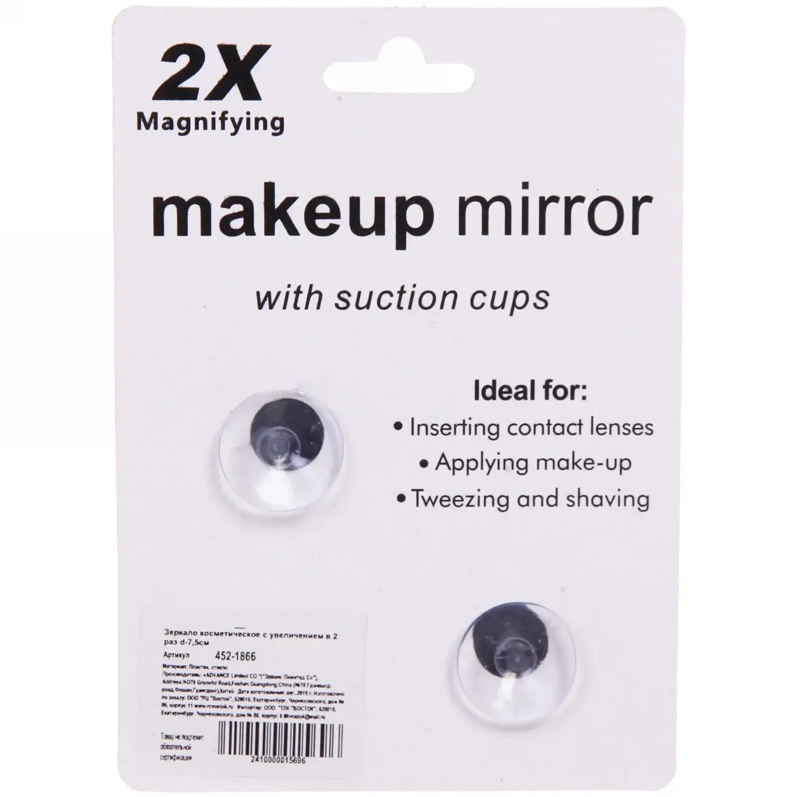 Зеркало идеально подходит для нанесения макияжа, вставки контактных линз, выщипывания и бритья. Оно оснащено двумя присосками на обратной стороне, что позволяет надежно крепить его на любой гладкой поверхности, будь то зеркало, плитка или стекло. Это делает его удобным в использовании в ванной комнате или на туалетном столике.