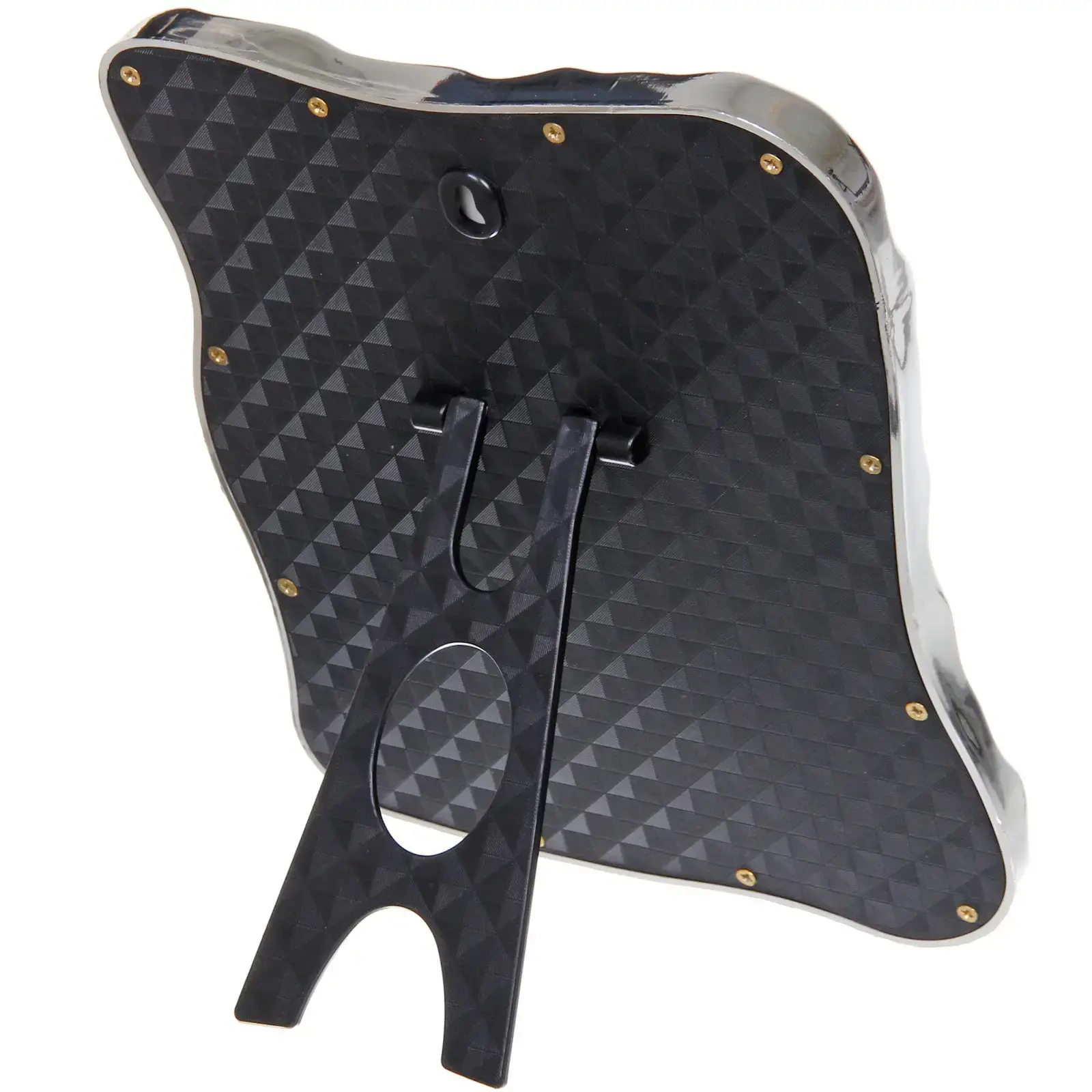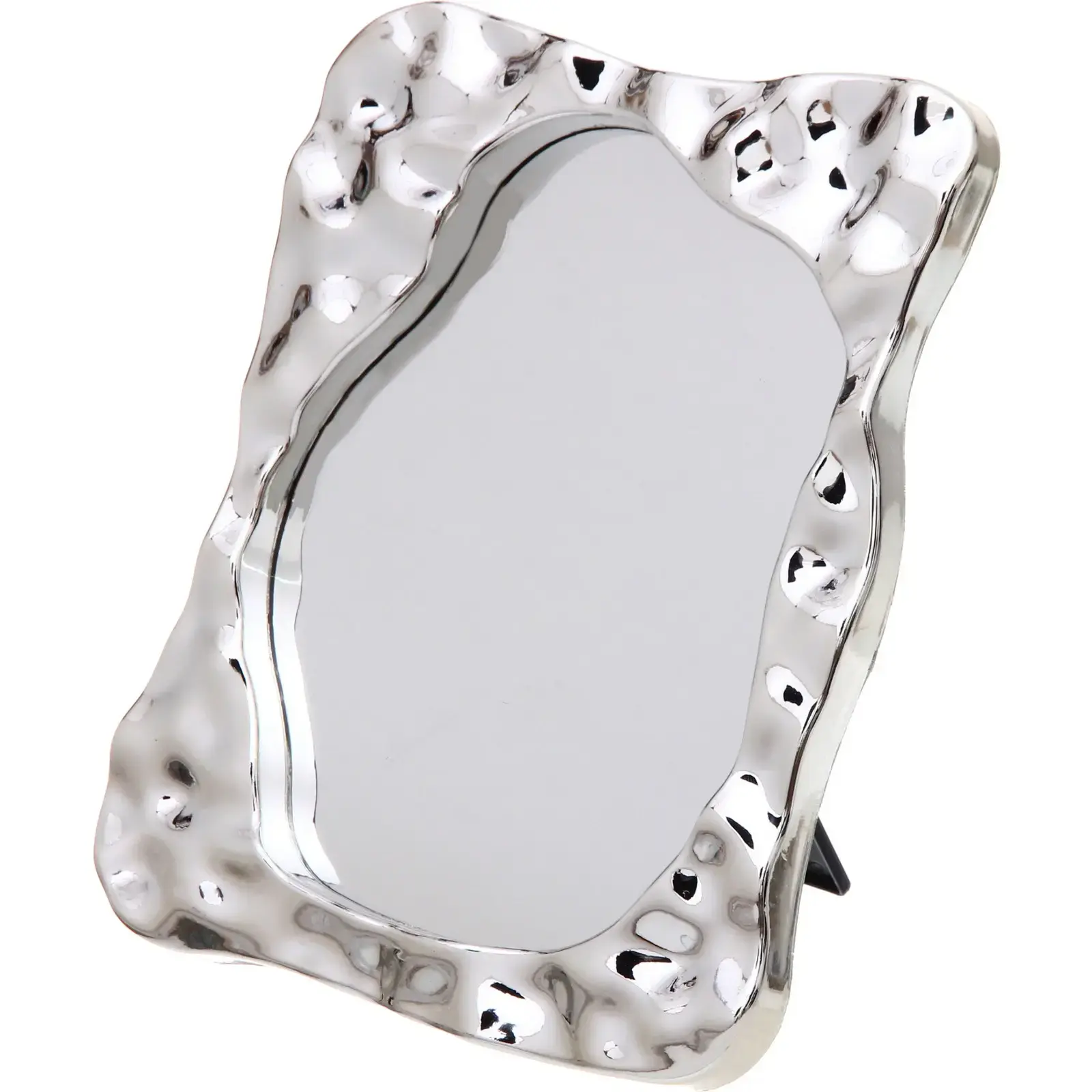 Стильный дизайн с геометрическим рельефом и металлическими элементами крепления обеспечивает надежность и современность. Подставка с фигурными вырезами обеспечивает стабильность и удобство использования. Compact and stylish, this mirror seamlessly fits into any modern interior, combining functionality and design.