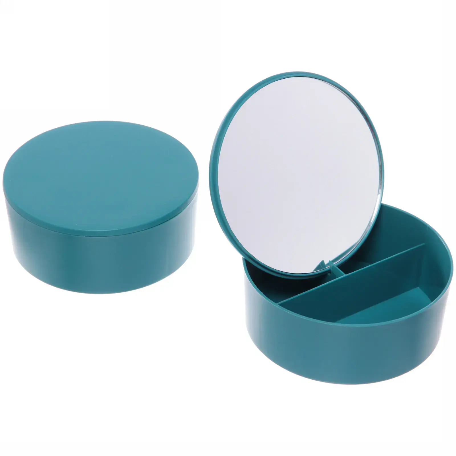Круглая форма без острых углов обеспечивает безопасность использования. Специальные перегородки внутри предотвращают смешивание содержимого отделений. Зеркало надежно закреплено в крышке и не смещается при открывании. Все детали изготовлены из экологичных материалов без резкого запаха.