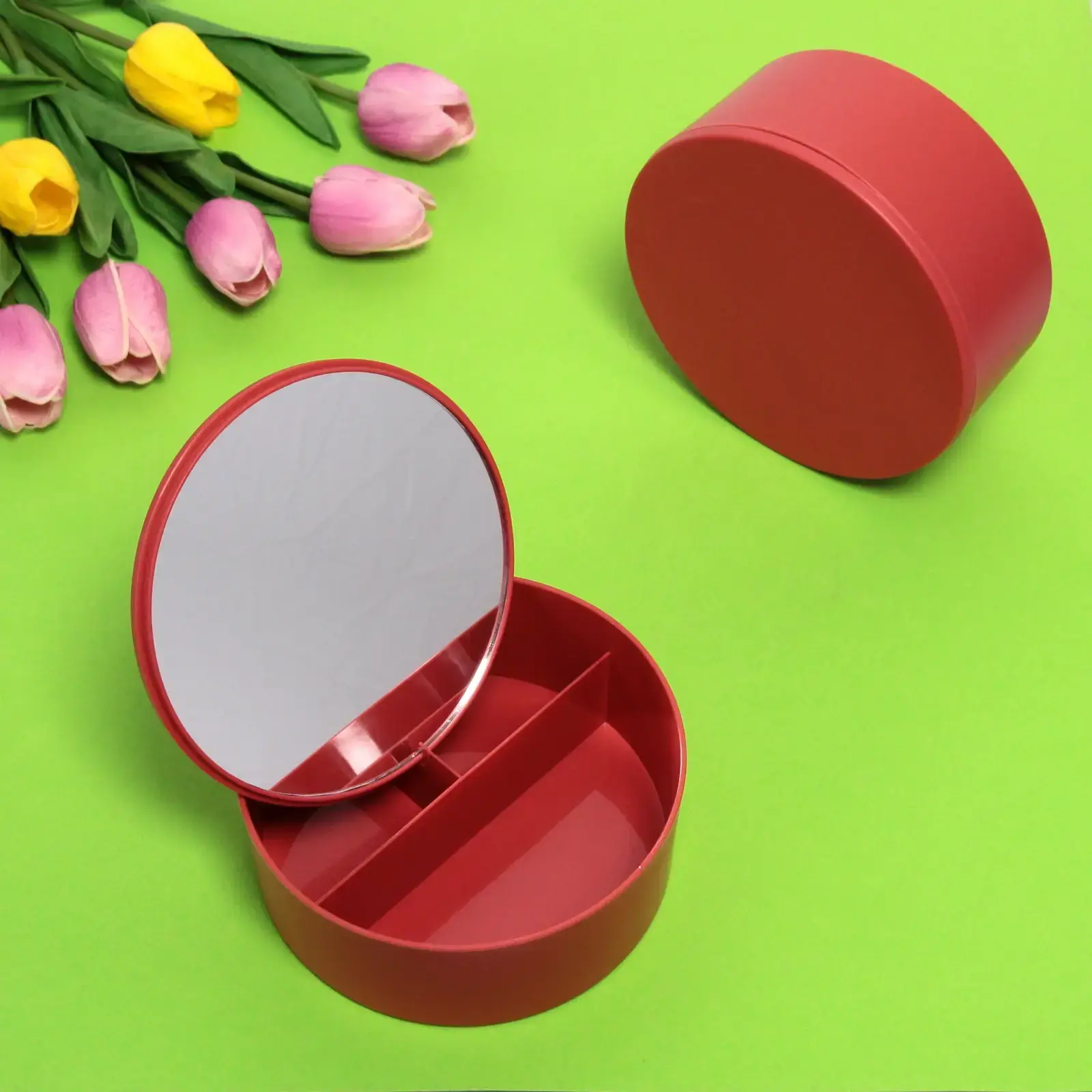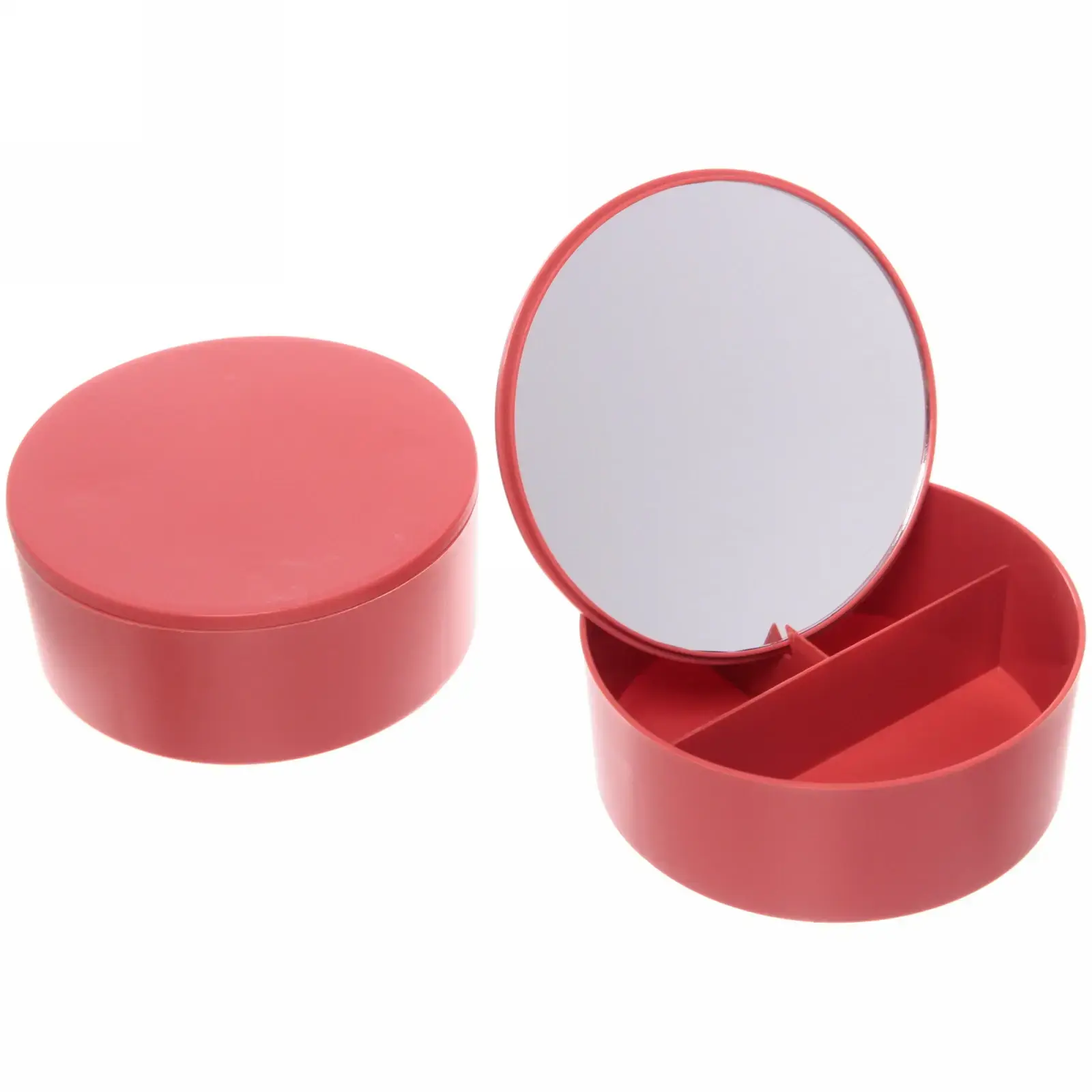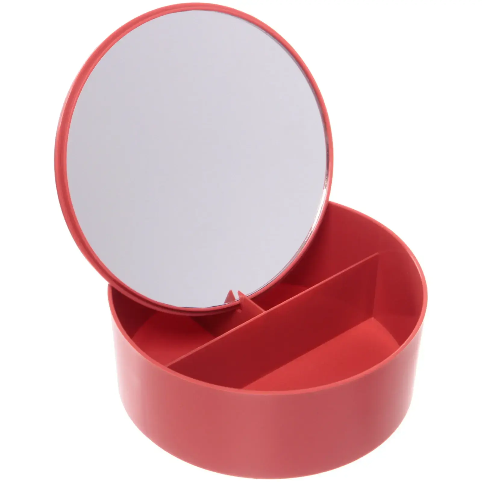 Гладкая пластиковая поверхность устойчива к царапинам и легко очищается от следов косметики. Прочное стеклянное зеркало не деформирует изображение, а закругленные края корпуса делают использование безопасным. Яркий красный цвет добавит стильный акцент в интерьер ванной комнаты или туалетного столика.