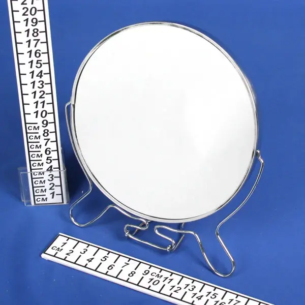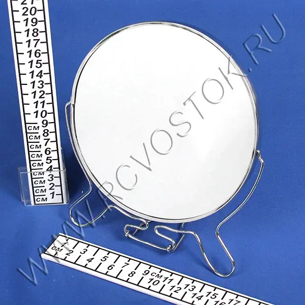 Зеркало изготовлено из качественных материалов: металлическая оправа гарантирует долговечность, а гладкая отражающая поверхность обеспечивает четкое изображение. Диаметр зеркала составляет 17 см, что делает его идеальным для размещения на туалетном столике или рабочей поверхности.