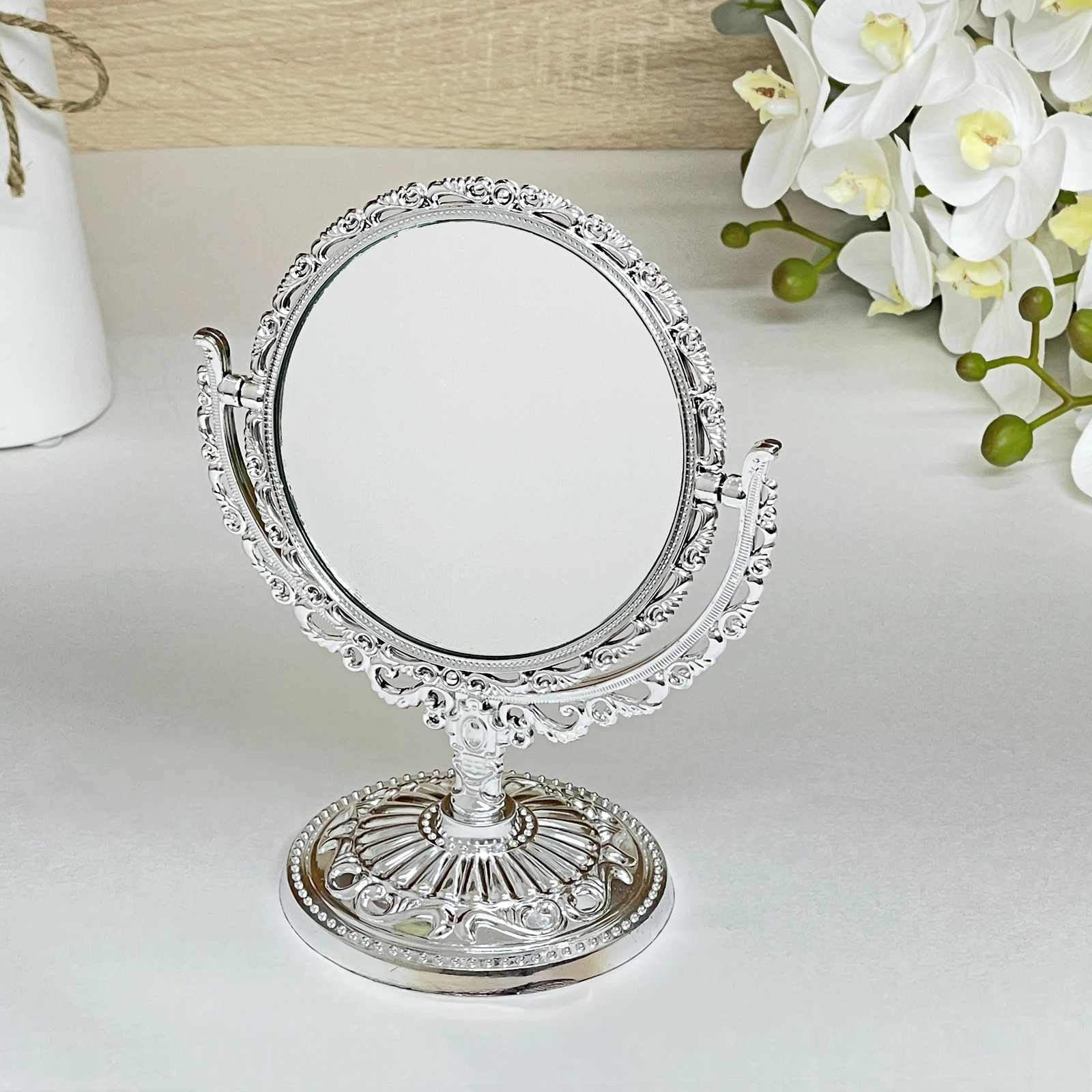 Зеркало выполнено из качественного стекла и пластика, что обеспечивает его долговечность и легкость в уходе. Серебристый цвет и рельефные узоры на подставке делают его не только функциональным, но и стильным элементом декора. Не упустите возможность добавить в свой дом этот прекрасный аксессуар, который станет вашим верным спутником в уходе за собой.