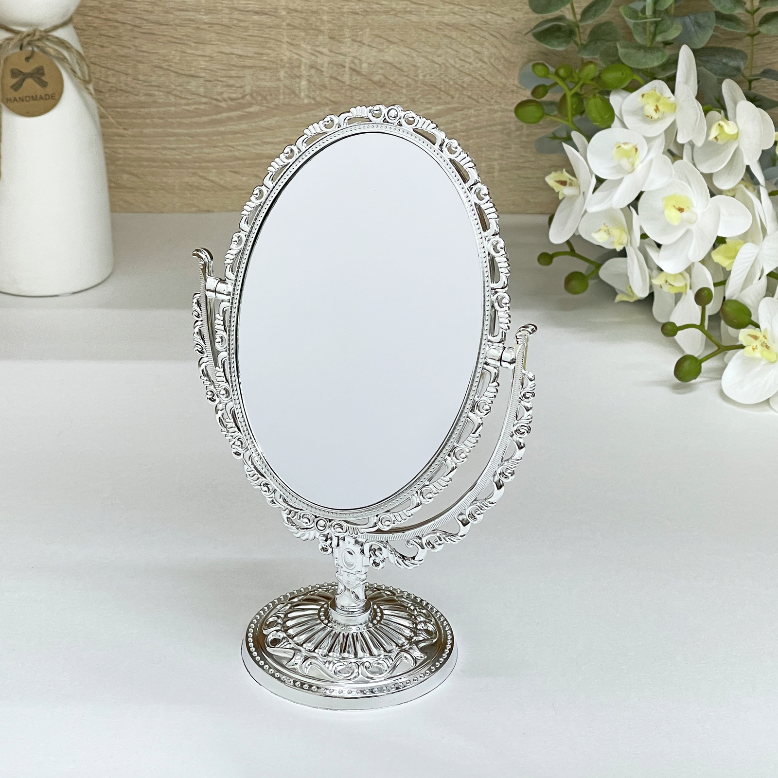 Зеркало настольное «Версаль - Овал» — это не просто аксессуар, а настоящее украшение вашего туалетного столика. Его изящный дизайн и стильная серебристая рамка делают его идеальным дополнением к любому интерьеру. Двухсторонняя конструкция позволяет вам видеть себя с разных ракурсов, что особенно удобно при выполнении косметических процедур. С этим зеркалом вы сможете легко устранить все недостатки кожи и добиться идеального макияжа.